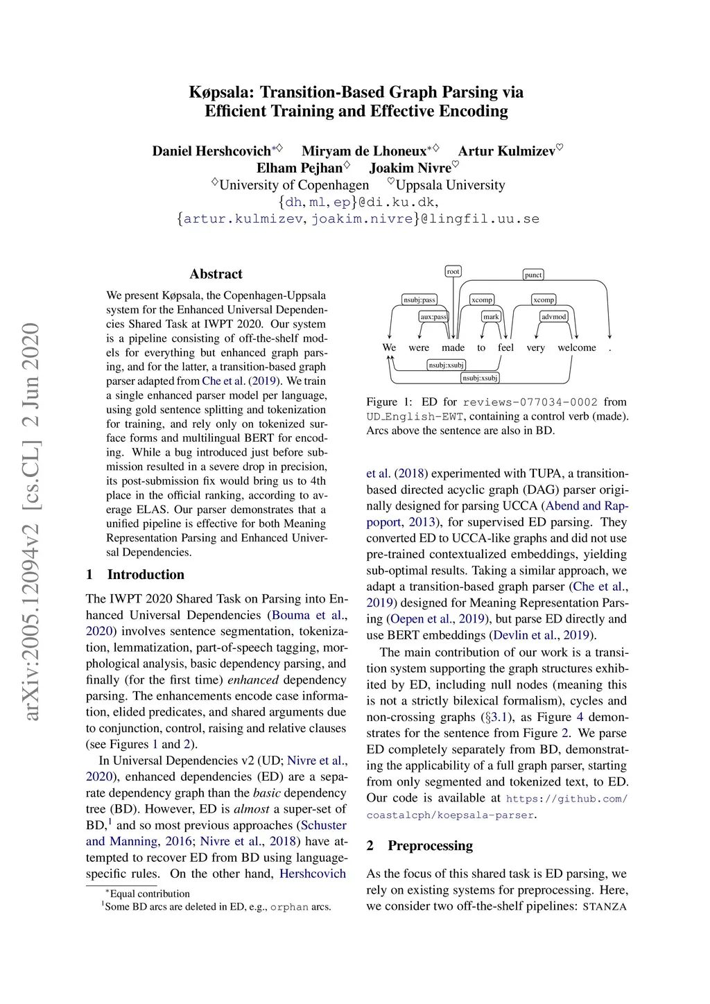 We present K{\o}psala, the Copenhagen-Uppsala system for the Enhanced Universal Dependencies Shared Task at IWPT 2020. Our system is a pipeline consisting of off-the-shelf models for everything but enhanced graph parsing, and for the latter, a transition-based graph parser adapted from Che et al. (2019). We train a single enhanced parser model per language, using gold sentence splitting and tokenization for training, and rely only on tokenized surface forms and multilingual BERT for encoding. While a bug introduced just before submission resulted in a severe drop in precision, its post-submission fix would bring us to 4th place in the official ranking, according to average ELAS. Our parser demonstrates that a unified pipeline is effective for both Meaning Representation Parsing and Enhanced Universal Dependencies.