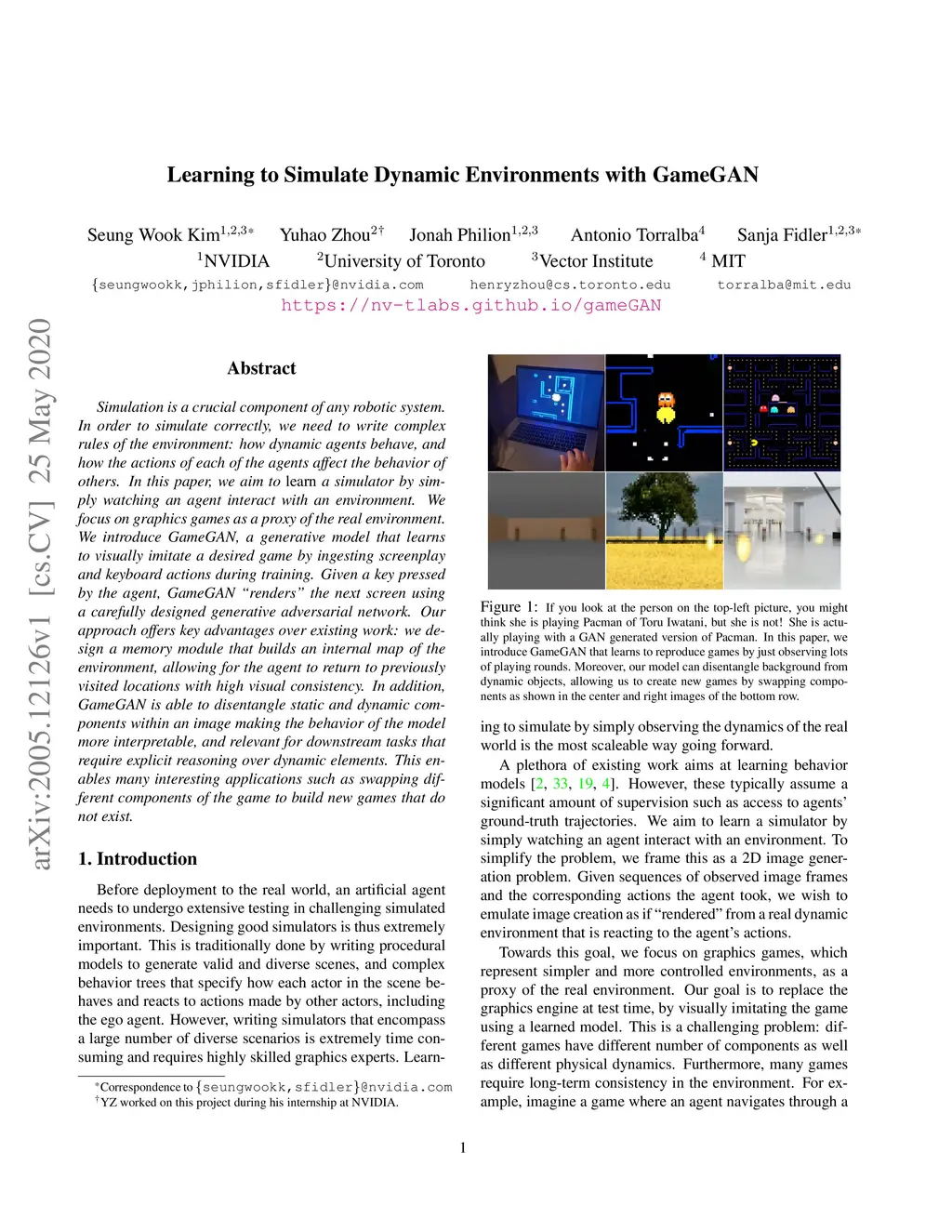 Simulation is a crucial component of any robotic system. In order to simulate correctly, we need to write complex rules of the environment: how dynamic agents behave, and how the actions of each of the agents affect the behavior of others. In this paper, we aim to learn a simulator by simply watching an agent interact with an environment. We focus on graphics games as a proxy of the real environment. We introduce GameGAN, a generative model that learns to visually imitate a desired game by ingesting screenplay and keyboard actions during training. Given a key pressed by the agent, GameGAN "renders" the next screen using a carefully designed generative adversarial network. Our approach offers key advantages over existing work: we design a memory module that builds an internal map of the environment, allowing for the agent to return to previously visited locations with high visual consistency. In addition, GameGAN is able to disentangle static and dynamic components within an image making the behavior of the model more interpretable, and relevant for downstream tasks that require explicit reasoning over dynamic elements. This enables many interesting applications such as swapping different components of the game to build new games that do not exist.