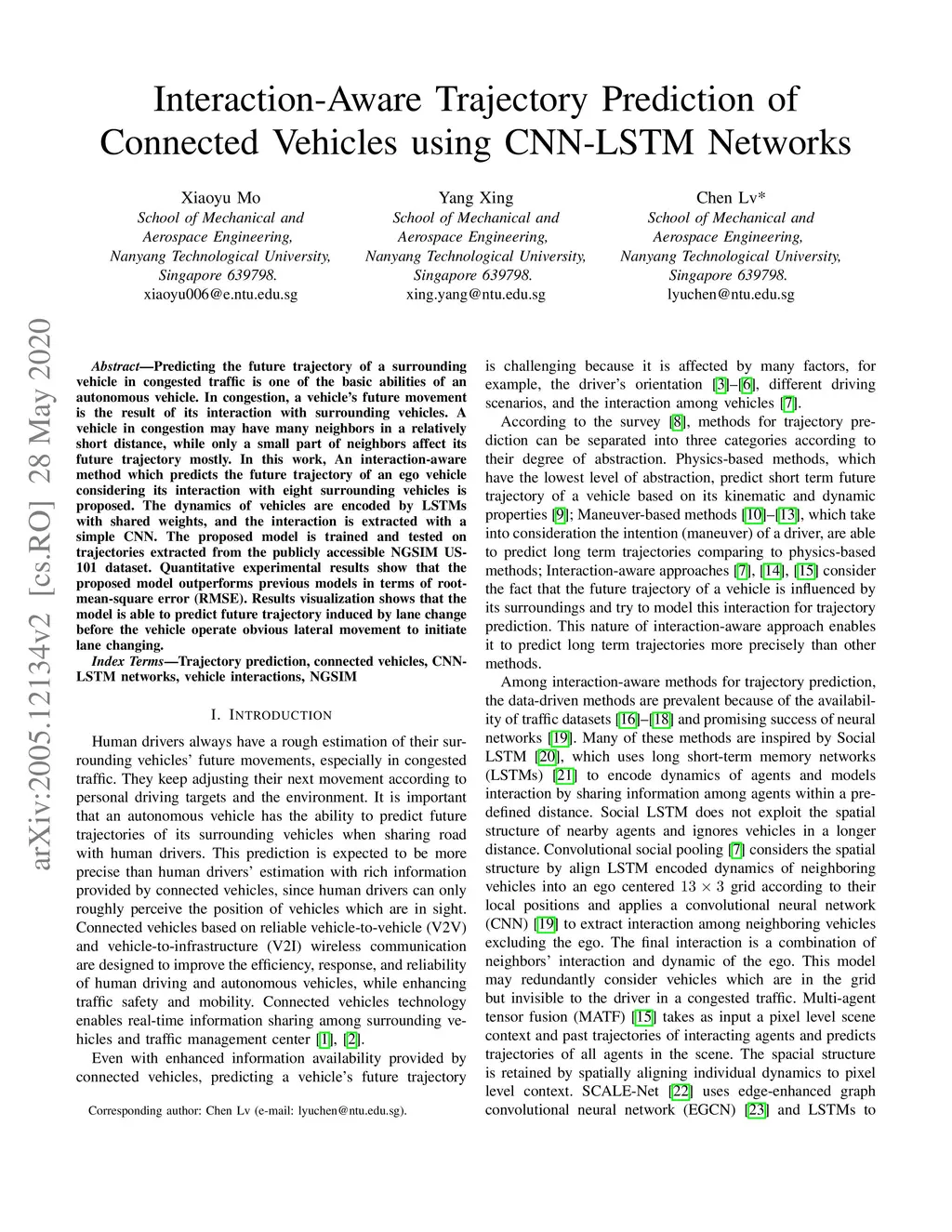 Predicting the future trajectory of a surrounding vehicle in congested traffic is one of the basic abilities of an autonomous vehicle. In congestion, a vehicle's future movement is the result of its interaction with surrounding vehicles. A vehicle in congestion may have many neighbors in a relatively short distance, while only a small part of neighbors affect its future trajectory mostly. In this work, An interaction-aware method which predicts the future trajectory of an ego vehicle considering its interaction with eight surrounding vehicles is proposed. The dynamics of vehicles are encoded by LSTMs with shared weights, and the interaction is extracted with a simple CNN. The proposed model is trained and tested on trajectories extracted from the publicly accessible NGSIM US-101 dataset. Quantitative experimental results show that the proposed model outperforms previous models in terms of root-mean-square error (RMSE). Results visualization shows that the model is able to predict future trajectory induced by lane change before the vehicle operate obvious lateral movement to initiate lane changing.