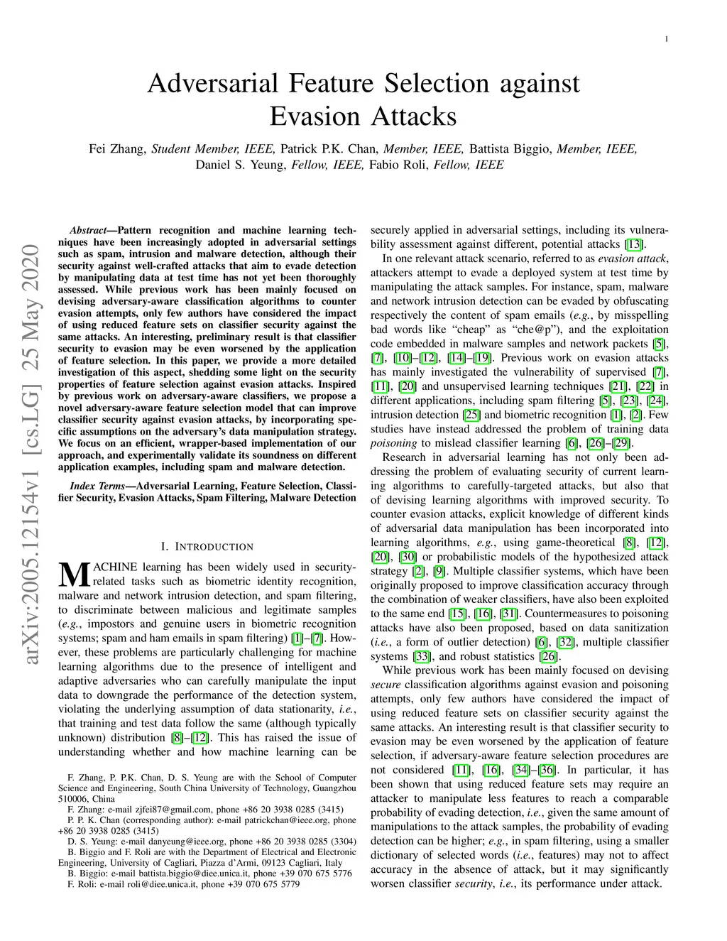 Pattern recognition and machine learning techniques have been increasingly adopted in adversarial settings such as spam, intrusion and malware detection, although their security against well-crafted attacks that aim to evade detection by manipulating data at test time has not yet been thoroughly assessed. While previous work has been mainly focused on devising adversary-aware classification algorithms to counter evasion attempts, only few authors have considered the impact of using reduced feature sets on classifier security against the same attacks. An interesting, preliminary result is that classifier security to evasion may be even worsened by the application of feature selection. In this paper, we provide a more detailed investigation of this aspect, shedding some light on the security properties of feature selection against evasion attacks. Inspired by previous work on adversary-aware classifiers, we propose a novel adversary-aware feature selection model that can improve classifier security against evasion attacks, by incorporating specific assumptions on the adversary's data manipulation strategy. We focus on an efficient, wrapper-based implementation of our approach, and experimentally validate its soundness on different application examples, including spam and malware detection.