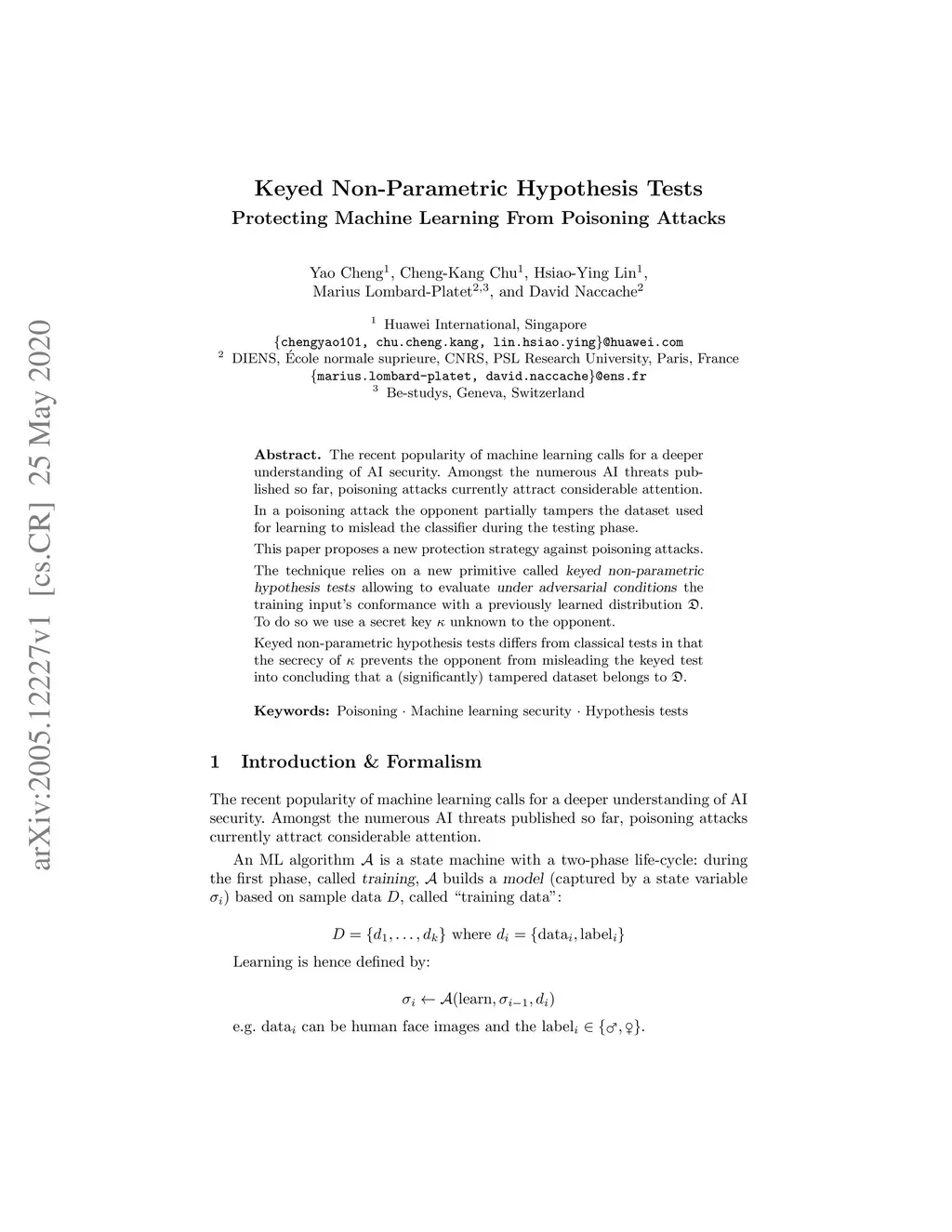The recent popularity of machine learning calls for a deeper understanding of AI security. Amongst the numerous AI threats published so far, poisoning attacks currently attract considerable attention. In a poisoning attack the opponent partially tampers the dataset used for learning to mislead the classifier during the testing phase. This paper proposes a new protection strategy against poisoning attacks. The technique relies on a new primitive called keyed non-parametric hypothesis tests allowing to evaluate under adversarial conditions the training input's conformance with a previously learned distribution . To do so we use a secret key unknown to the opponent. Keyed non-parametric hypothesis tests differs from classical tests in that the secrecy of prevents the opponent from misleading the keyed test into concluding that a (significantly) tampered dataset belongs to .