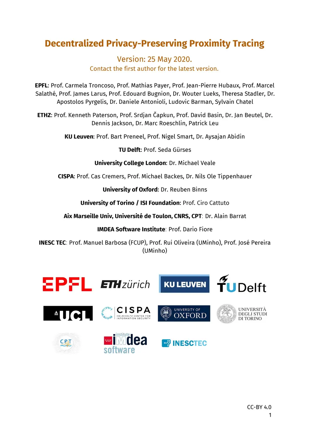 This document describes and analyzes a system for secure and privacy-preserving proximity tracing at large scale. This system, referred to as DP3T, provides a technological foundation to help slow the spread of SARS-CoV-2 by simplifying and accelerating the process of notifying people who might have been exposed to the virus so that they can take appropriate measures to break its transmission chain. The system aims to minimise privacy and security risks for individuals and communities and guarantee the highest level of data protection. The goal of our proximity tracing system is to determine who has been in close physical proximity to a COVID-19 positive person and thus exposed to the virus, without revealing the contact's identity or where the contact occurred. To achieve this goal, users run a smartphone app that continually broadcasts an ephemeral, pseudo-random ID representing the user's phone and also records the pseudo-random IDs observed from smartphones in close proximity. When a patient is diagnosed with COVID-19, she can upload pseudo-random IDs previously broadcast from her phone to a central server. Prior to the upload, all data remains exclusively on the user's phone. Other users' apps can use data from the server to locally estimate whether the device's owner was exposed to the virus through close-range physical proximity to a COVID-19 positive person who has uploaded their data. In case the app detects a high risk, it will inform the user.