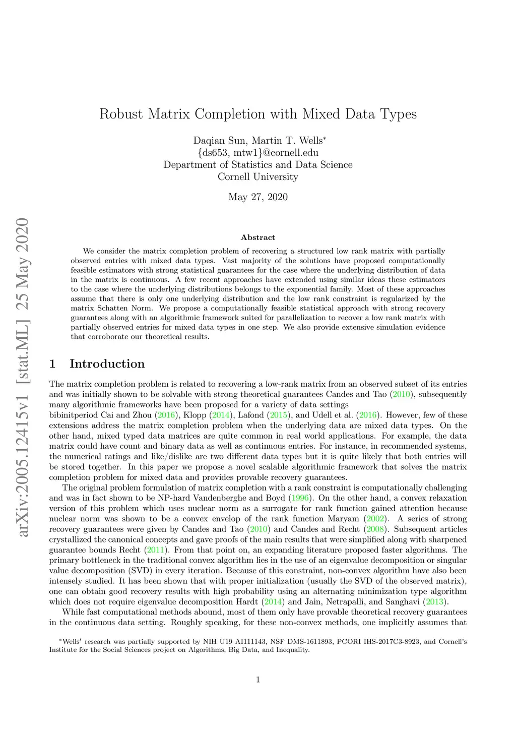 We consider the matrix completion problem of recovering a structured low rank matrix with partially observed entries with mixed data types. Vast majority of the solutions have proposed computationally feasible estimators with strong statistical guarantees for the case where the underlying distribution of data in the matrix is continuous. A few recent approaches have extended using similar ideas these estimators to the case where the underlying distributions belongs to the exponential family. Most of these approaches assume that there is only one underlying distribution and the low rank constraint is regularized by the matrix Schatten Norm. We propose a computationally feasible statistical approach with strong recovery guarantees along with an algorithmic framework suited for parallelization to recover a low rank matrix with partially observed entries for mixed data types in one step. We also provide extensive simulation evidence that corroborate our theoretical results.