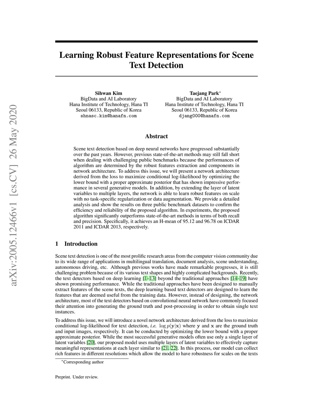 Scene text detection based on deep neural networks have progressed substantially over the past years. However, previous state-of-the-art methods may still fall short when dealing with challenging public benchmarks because the performances of algorithm are determined by the robust features extraction and components in network architecture. To address this issue, we will present a network architecture derived from the loss to maximize conditional log-likelihood by optimizing the lower bound with a proper approximate posterior that has shown impressive performance in several generative models. In addition, by extending the layer of latent variables to multiple layers, the network is able to learn robust features on scale with no task-specific regularization or data augmentation. We provide a detailed analysis and show the results on three public benchmark datasets to confirm the efficiency and reliability of the proposed algorithm. In experiments, the proposed algorithm significantly outperforms state-of-the-art methods in terms of both recall and precision. Specifically, it achieves an H-mean of 95.12 and 96.78 on ICDAR 2011 and ICDAR 2013, respectively.