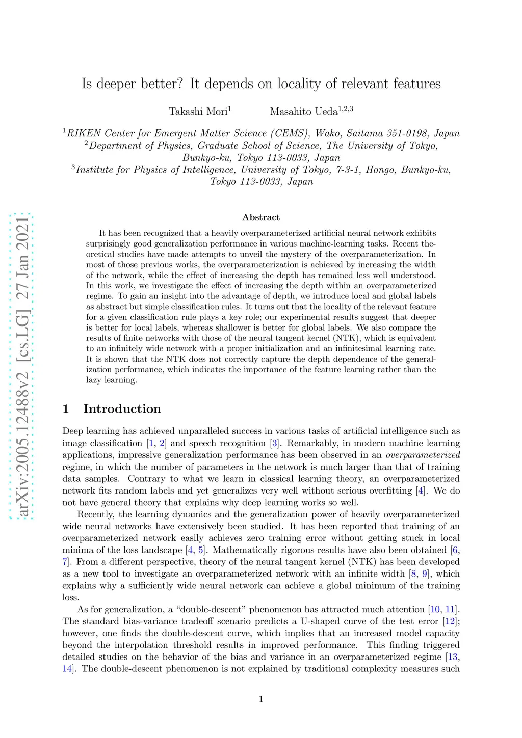 It has been recognized that a heavily overparameterized artificial neural network exhibits surprisingly good generalization performance in various machine-learning tasks. Recent theoretical studies have made attempts to unveil the mystery of the overparameterization. In most of those previous works, the overparameterization is achieved by increasing the width of the network, while the effect of increasing the depth has remained less well understood. In this work, we investigate the effect of increasing the depth within an overparameterized regime. To gain an insight into the advantage of depth, we introduce local and global labels as abstract but simple classification rules. It turns out that the locality of the relevant feature for a given classification rule plays a key role; our experimental results suggest that deeper is better for local labels, whereas shallower is better for global labels. We also compare the results of finite networks with those of the neural tangent kernel (NTK), which is equivalent to an infinitely wide network with a proper initialization and an infinitesimal learning rate. It is shown that the NTK does not correctly capture the depth dependence of the generalization performance, which indicates the importance of the feature learning rather than the lazy learning.
