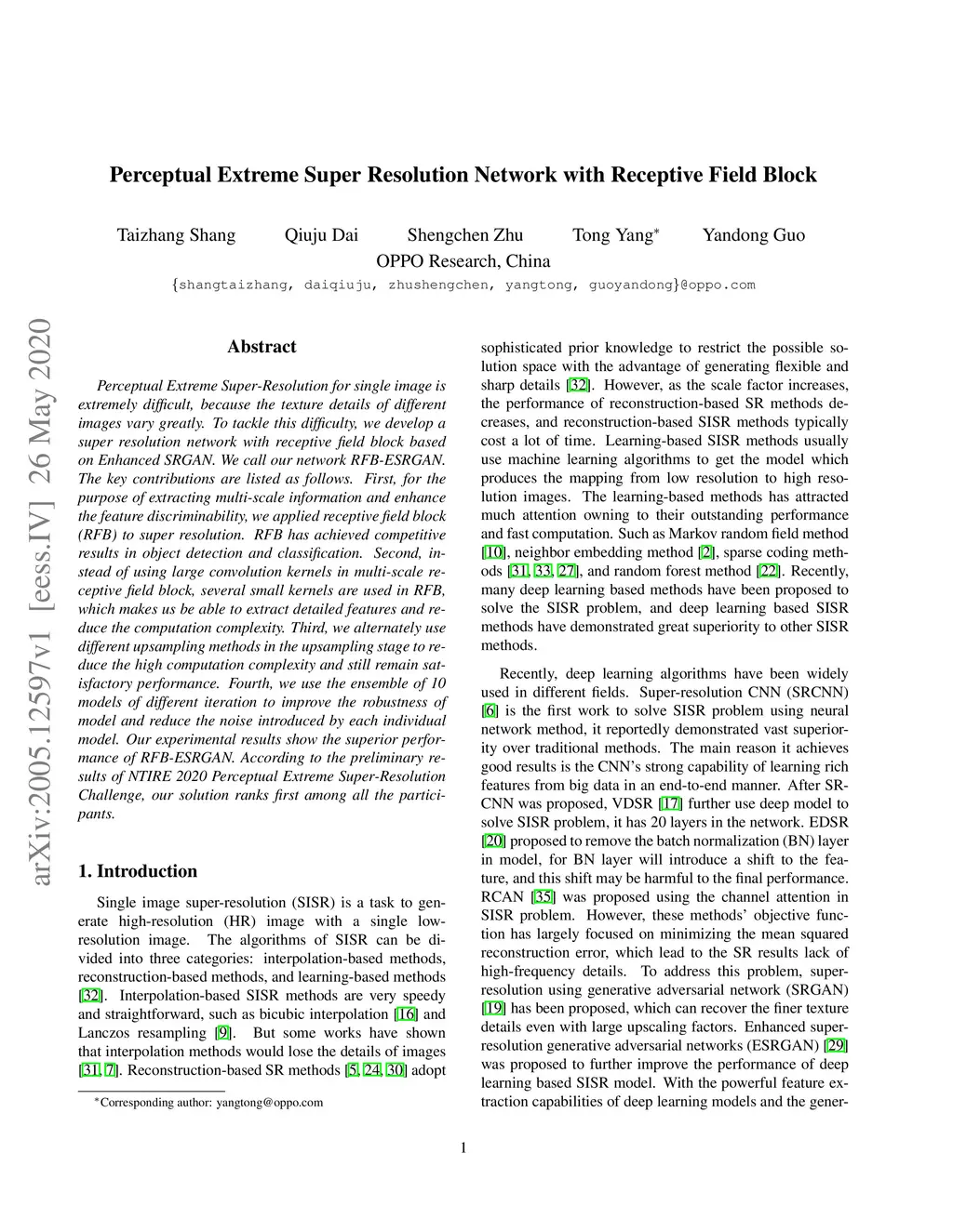 Perceptual Extreme Super-Resolution for single image is extremely difficult, because the texture details of different images vary greatly. To tackle this difficulty, we develop a super resolution network with receptive field block based on Enhanced SRGAN. We call our network RFB-ESRGAN. The key contributions are listed as follows. First, for the purpose of extracting multi-scale information and enhance the feature discriminability, we applied receptive field block (RFB) to super resolution. RFB has achieved competitive results in object detection and classification. Second, instead of using large convolution kernels in multi-scale receptive field block, several small kernels are used in RFB, which makes us be able to extract detailed features and reduce the computation complexity. Third, we alternately use different upsampling methods in the upsampling stage to reduce the high computation complexity and still remain satisfactory performance. Fourth, we use the ensemble of 10 models of different iteration to improve the robustness of model and reduce the noise introduced by each individual model. Our experimental results show the superior performance of RFB-ESRGAN. According to the preliminary results of NTIRE 2020 Perceptual Extreme Super-Resolution Challenge, our solution ranks first among all the participants.