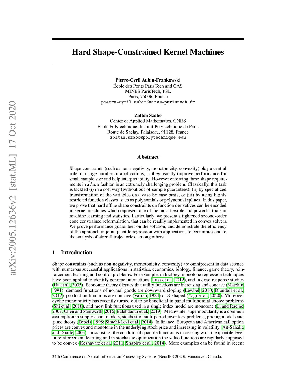 Shape constraints (such as non-negativity, monotonicity, convexity) play a central role in a large number of applications, as they usually improve performance for small sample size and help interpretability. However enforcing these shape requirements in a hard fashion is an extremely challenging problem. Classically, this task is tackled (i) in a soft way (without out-of-sample guarantees), (ii) by specialized transformation of the variables on a case-by-case basis, or (iii) by using highly restricted function classes, such as polynomials or polynomial splines. In this paper, we prove that hard affine shape constraints on function derivatives can be encoded in kernel machines which represent one of the most flexible and powerful tools in machine learning and statistics. Particularly, we present a tightened second-order cone constrained reformulation, that can be readily implemented in convex solvers. We prove performance guarantees on the solution, and demonstrate the efficiency of the approach in joint quantile regression with applications to economics and to the analysis of aircraft trajectories, among others.