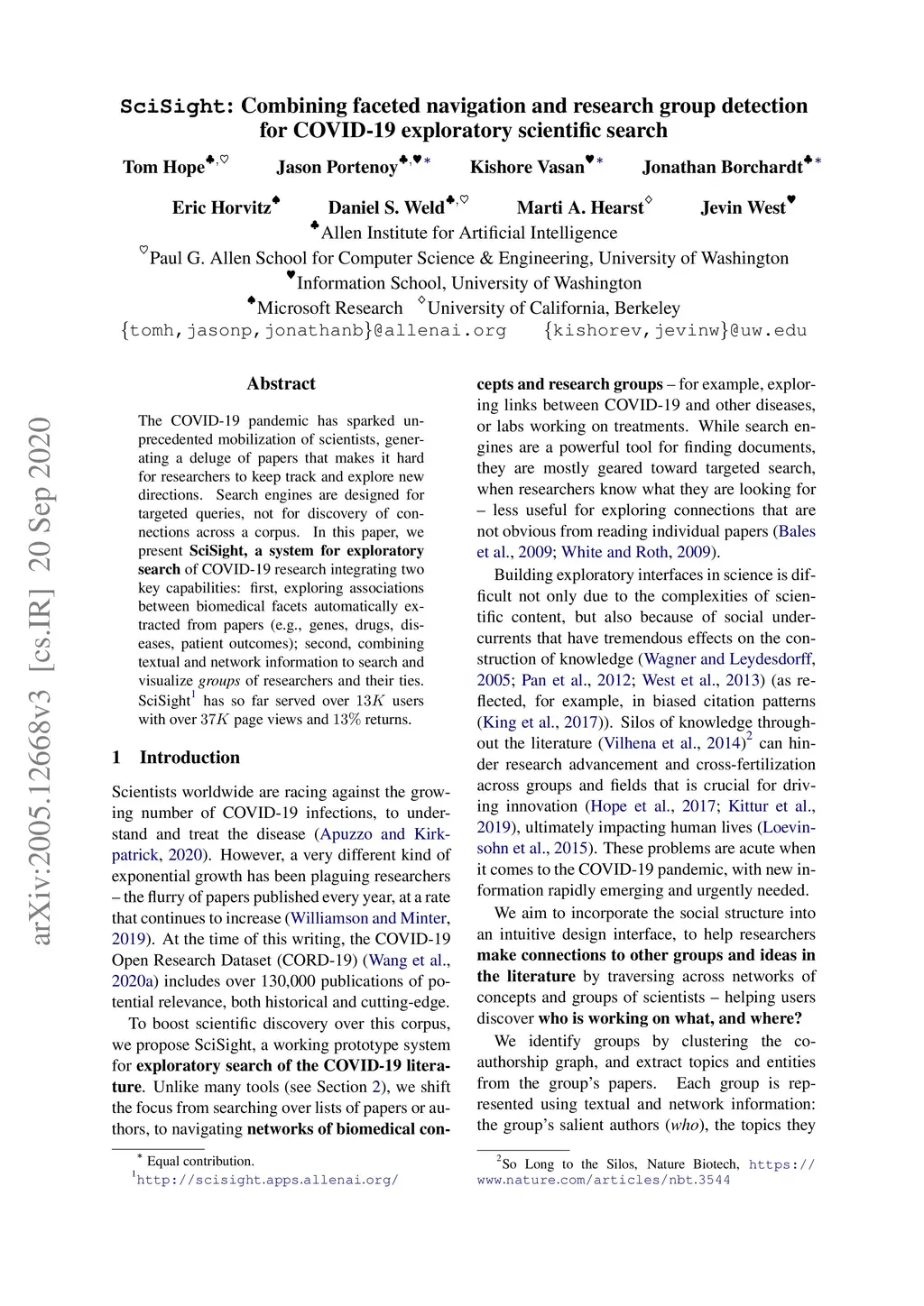 The COVID-19 pandemic has sparked unprecedented mobilization of scientists, generating a deluge of papers that makes it hard for researchers to keep track and explore new directions. Search engines are designed for targeted queries, not for discovery of connections across a corpus. In this paper, we present SciSight, a system for exploratory search of COVID-19 research integrating two key capabilities: first, exploring associations between biomedical facets automatically extracted from papers (e.g., genes, drugs, diseases, patient outcomes); second, combining textual and network information to search and visualize groups of researchers and their ties. SciSight has so far served over users with over page views and returns.