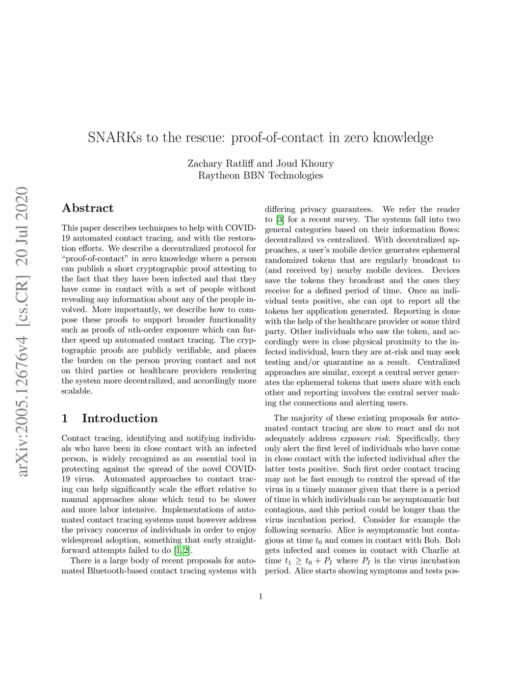 This paper describes techniques to help with COVID-19 automated contact tracing, and with the restoration efforts. We describe a decentralized protocol for ``proof-of-contact'' in zero knowledge where a person can publish a short cryptographic proof attesting to the fact that they have been infected and that they have come in contact with a set of people without revealing any information about any of the people involved. More importantly, we describe how to compose these proofs to support broader functionality such as proofs of th-order exposure which can further speed up automated contact tracing. The cryptographic proofs are publicly verifiable, and places the burden on the person proving contact and not on third parties or healthcare providers rendering the system more decentralized, and accordingly more scalable.