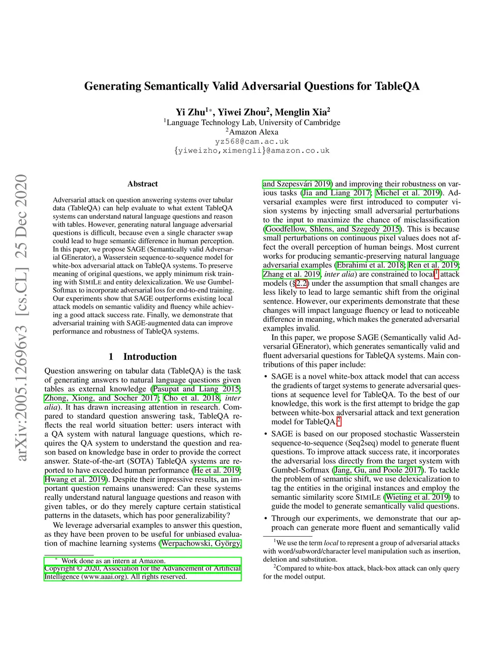 Adversarial attack on question answering systems over tabular data (TableQA) can help evaluate to what extent they can understand natural language questions and reason with tables. However, generating natural language adversarial questions is difficult, because even a single character swap could lead to huge semantic difference in human perception. In this paper, we propose SAGE (Semantically valid Adversarial GEnerator), a Wasserstein sequence-to-sequence model for TableQA white-box attack. To preserve meaning of original questions, we apply minimum risk training with SIMILE and entity delexicalization. We use Gumbel-Softmax to incorporate adversarial loss for end-to-end training. Our experiments show that SAGE outperforms existing local attack models on semantic validity and fluency while achieving a good attack success rate. Finally, we demonstrate that adversarial training with SAGE augmented data can improve performance and robustness of TableQA systems.
