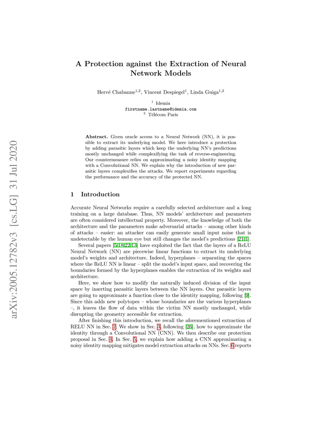 Given oracle access to a Neural Network (NN), it is possible to extract its underlying model. We here introduce a protection by adding parasitic layers which keep the underlying NN's predictions mostly unchanged while complexifying the task of reverse-engineering. Our countermeasure relies on approximating a noisy identity mapping with a Convolutional NN. We explain why the introduction of new parasitic layers complexifies the attacks. We report experiments regarding the performance and the accuracy of the protected NN.