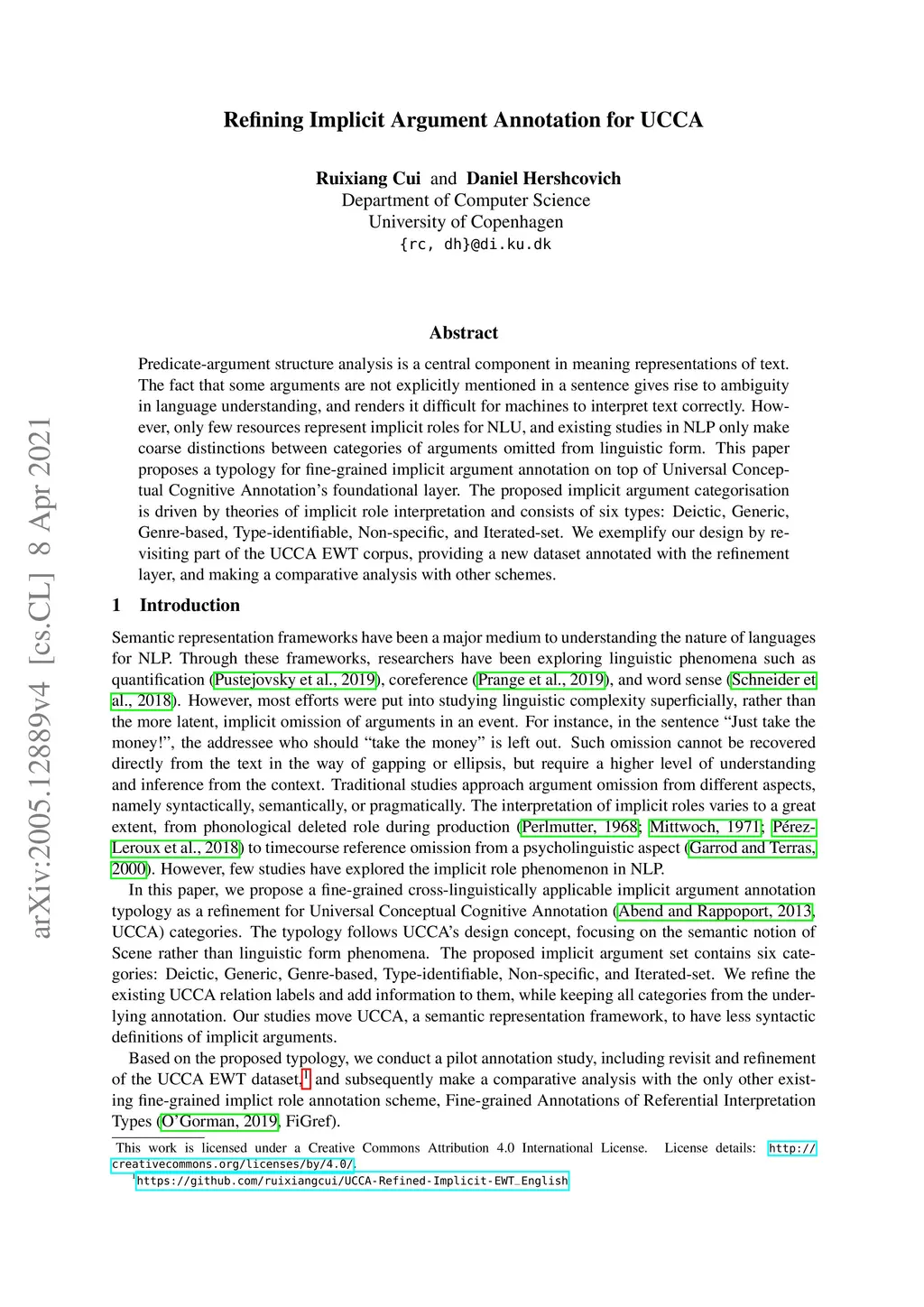 Predicate-argument structure analysis is a central component in meaning representations of text. The fact that some arguments are not explicitly mentioned in a sentence gives rise to ambiguity in language understanding, and renders it difficult for machines to interpret text correctly. However, only few resources represent implicit roles for NLU, and existing studies in NLP only make coarse distinctions between categories of arguments omitted from linguistic form. This paper proposes a typology for fine-grained implicit argument annotation on top of Universal Conceptual Cognitive Annotation's foundational layer. The proposed implicit argument categorisation is driven by theories of implicit role interpretation and consists of six types: Deictic, Generic, Genre-based, Type-identifiable, Non-specific, and Iterated-set. We exemplify our design by revisiting part of the UCCA EWT corpus, providing a new dataset annotated with the refinement layer, and making a comparative analysis with other schemes.