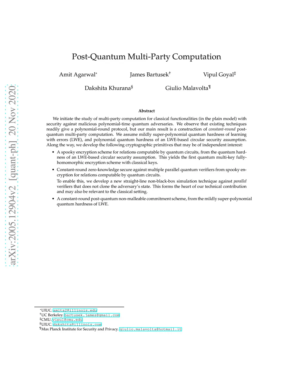 We initiate the study of multi-party computation for classical functionalities (in the plain model) with security against malicious polynomial-time quantum adversaries. We observe that existing techniques readily give a polynomial-round protocol, but our main result is a construction of *constant-round* post-quantum multi-party computation. We assume mildly super-polynomial quantum hardness of learning with errors (LWE), and polynomial quantum hardness of an LWE-based circular security assumption. Along the way, we develop the following cryptographic primitives that may be of independent interest: 1. A spooky encryption scheme for relations computable by quantum circuits, from the quantum hardness of an LWE-based circular security assumption. This yields the first quantum multi-key fully-homomorphic encryption scheme with classical keys. 2. Constant-round zero-knowledge secure against multiple parallel quantum verifiers from spooky encryption for relations computable by quantum circuits. To enable this, we develop a new straight-line non-black-box simulation technique against *parallel* verifiers that does not clone the adversary's state. This forms the heart of our technical contribution and may also be relevant to the classical setting. 3. A constant-round post-quantum non-malleable commitment scheme, from the mildly super-polynomial quantum hardness of LWE.