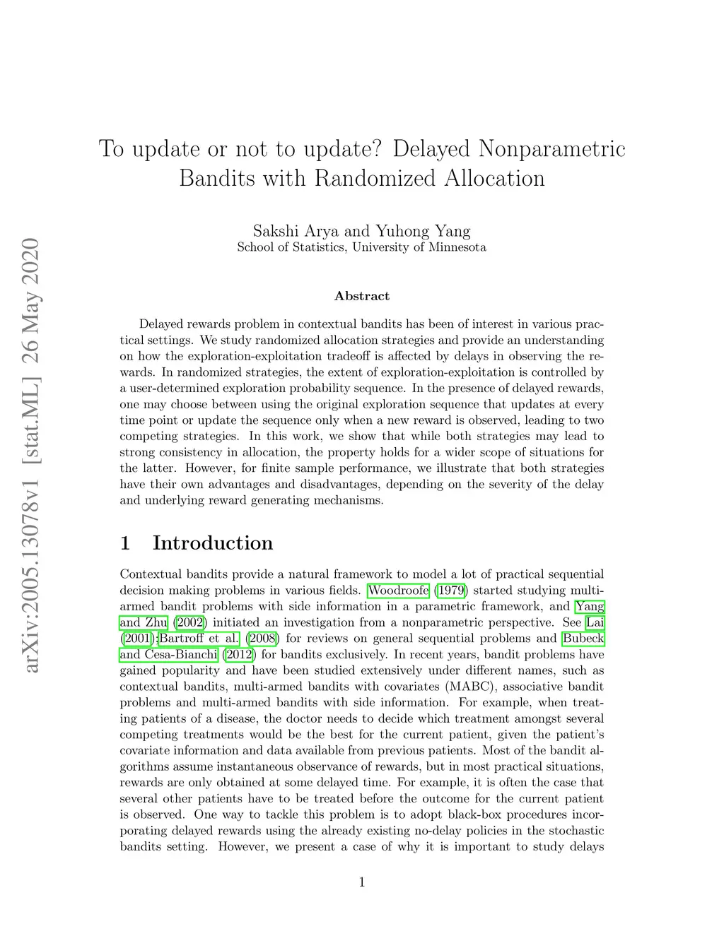 Delayed rewards problem in contextual bandits has been of interest in various practical settings. We study randomized allocation strategies and provide an understanding on how the exploration-exploitation tradeoff is affected by delays in observing the rewards. In randomized strategies, the extent of exploration-exploitation is controlled by a user-determined exploration probability sequence. In the presence of delayed rewards, one may choose between using the original exploration sequence that updates at every time point or update the sequence only when a new reward is observed, leading to two competing strategies. In this work, we show that while both strategies may lead to strong consistency in allocation, the property holds for a wider scope of situations for the latter. However, for finite sample performance, we illustrate that both strategies have their own advantages and disadvantages, depending on the severity of the delay and underlying reward generating mechanisms.