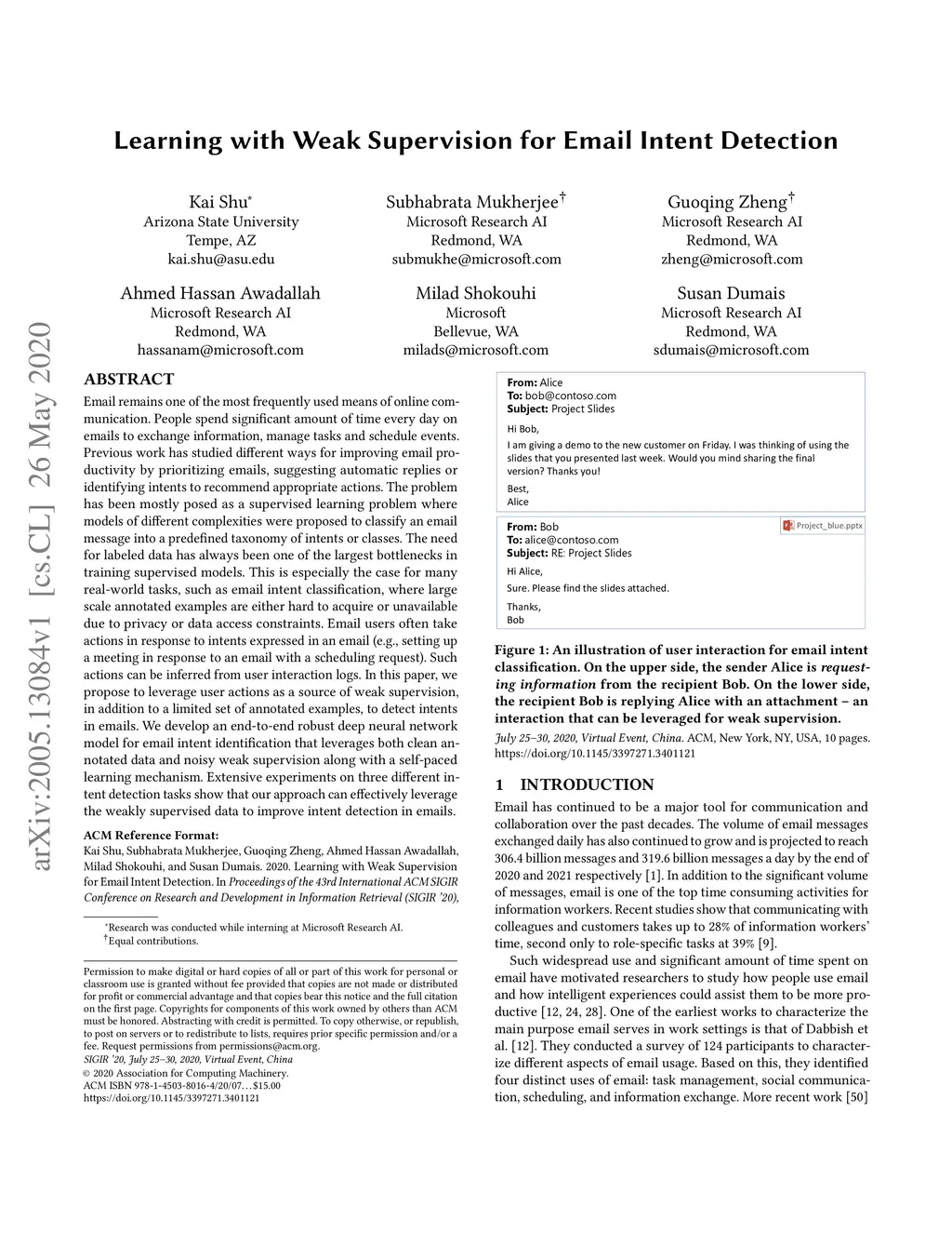 Email remains one of the most frequently used means of online communication. People spend a significant amount of time every day on emails to exchange information, manage tasks and schedule events. Previous work has studied different ways for improving email productivity by prioritizing emails, suggesting automatic replies or identifying intents to recommend appropriate actions. The problem has been mostly posed as a supervised learning problem where models of different complexities were proposed to classify an email message into a predefined taxonomy of intents or classes. The need for labeled data has always been one of the largest bottlenecks in training supervised models. This is especially the case for many real-world tasks, such as email intent classification, where large scale annotated examples are either hard to acquire or unavailable due to privacy or data access constraints. Email users often take actions in response to intents expressed in an email (e.g., setting up a meeting in response to an email with a scheduling request). Such actions can be inferred from user interaction logs. In this paper, we propose to leverage user actions as a source of weak supervision, in addition to a limited set of annotated examples, to detect intents in emails. We develop an end-to-end robust deep neural network model for email intent identification that leverages both clean annotated data and noisy weak supervision along with a self-paced learning mechanism. Extensive experiments on three different intent detection tasks show that our approach can effectively leverage the weakly supervised data to improve intent detection in emails.