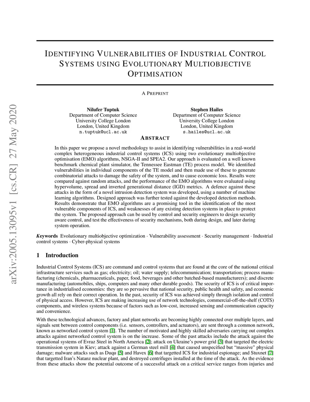 In this paper we propose a novel methodology to assist in identifying vulnerabilities in a real-world complex heterogeneous industrial control systems (ICS) using two evolutionary multiobjective optimisation (EMO) algorithms, NSGA-II and SPEA2. Our approach is evaluated on a well known benchmark chemical plant simulator, the Tennessee Eastman (TE) process model. We identified vulnerabilities in individual components of the TE model and then made use of these to generate combinatorial attacks to damage the safety of the system, and to cause economic loss. Results were compared against random attacks, and the performance of the EMO algorithms were evaluated using hypervolume, spread and inverted generational distance (IGD) metrics. A defence against these attacks in the form of a novel intrusion detection system was developed, using a number of machine learning algorithms. Designed approach was further tested against the developed detection methods. Results demonstrate that EMO algorithms are a promising tool in the identification of the most vulnerable components of ICS, and weaknesses of any existing detection systems in place to protect the system. The proposed approach can be used by control and security engineers to design security aware control, and test the effectiveness of security mechanisms, both during design, and later during system operation.
