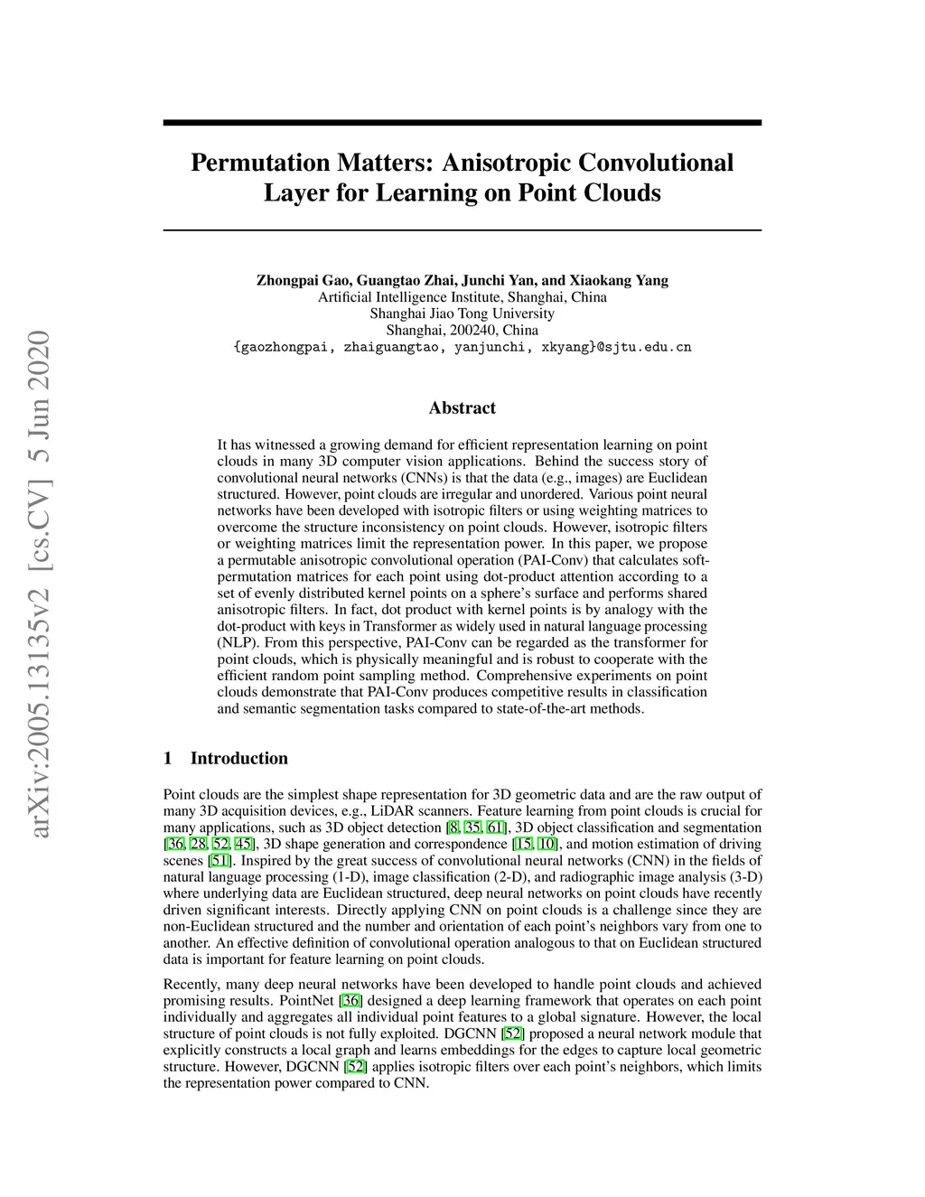 It has witnessed a growing demand for efficient representation learning on point clouds in many 3D computer vision applications. Behind the success story of convolutional neural networks (CNNs) is that the data (e.g., images) are Euclidean structured. However, point clouds are irregular and unordered. Various point neural networks have been developed with isotropic filters or using weighting matrices to overcome the structure inconsistency on point clouds. However, isotropic filters or weighting matrices limit the representation power. In this paper, we propose a permutable anisotropic convolutional operation (PAI-Conv) that calculates soft-permutation matrices for each point using dot-product attention according to a set of evenly distributed kernel points on a sphere's surface and performs shared anisotropic filters. In fact, dot product with kernel points is by analogy with the dot-product with keys in Transformer as widely used in natural language processing (NLP). From this perspective, PAI-Conv can be regarded as the transformer for point clouds, which is physically meaningful and is robust to cooperate with the efficient random point sampling method. Comprehensive experiments on point clouds demonstrate that PAI-Conv produces competitive results in classification and semantic segmentation tasks compared to state-of-the-art methods.