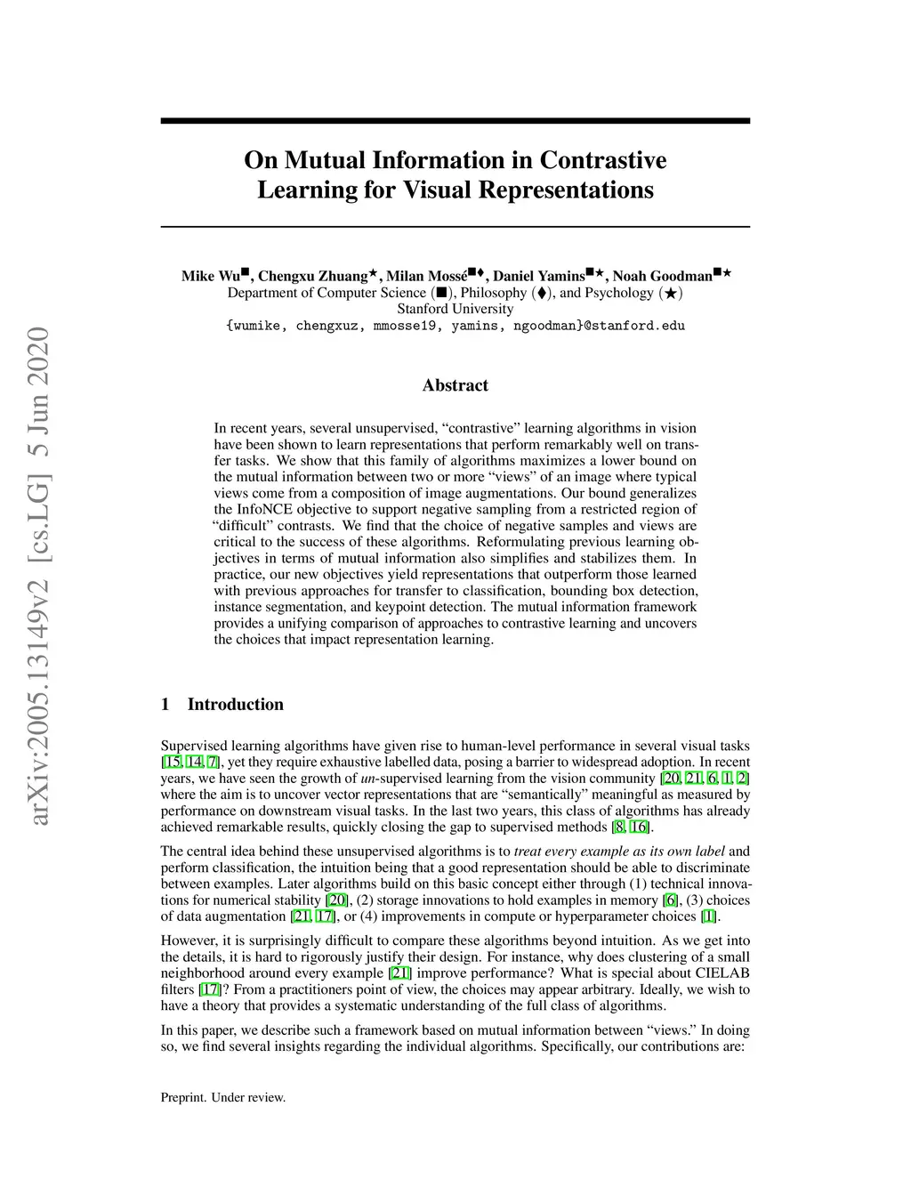 In recent years, several unsupervised, "contrastive" learning algorithms in vision have been shown to learn representations that perform remarkably well on transfer tasks. We show that this family of algorithms maximizes a lower bound on the mutual information between two or more "views" of an image; typical views come from a composition of image augmentations. Our bound generalizes the InfoNCE objective to support negative sampling from a restricted region of "difficult" contrasts. We find that the choice of (1) negative samples and (2) "views" are critical to the success of contrastive learning, the former of which is largely unexplored. The mutual information reformulation also simplifies and stabilizes previous learning objectives. In practice, our new objectives yield representations that outperform those learned with previous approaches for transfer to classification, bounding box detection, instance segmentation, and keypoint detection. The mutual information framework provides a unifying and rigorous comparison of approaches to contrastive learning and uncovers the choices that impact representation learning.