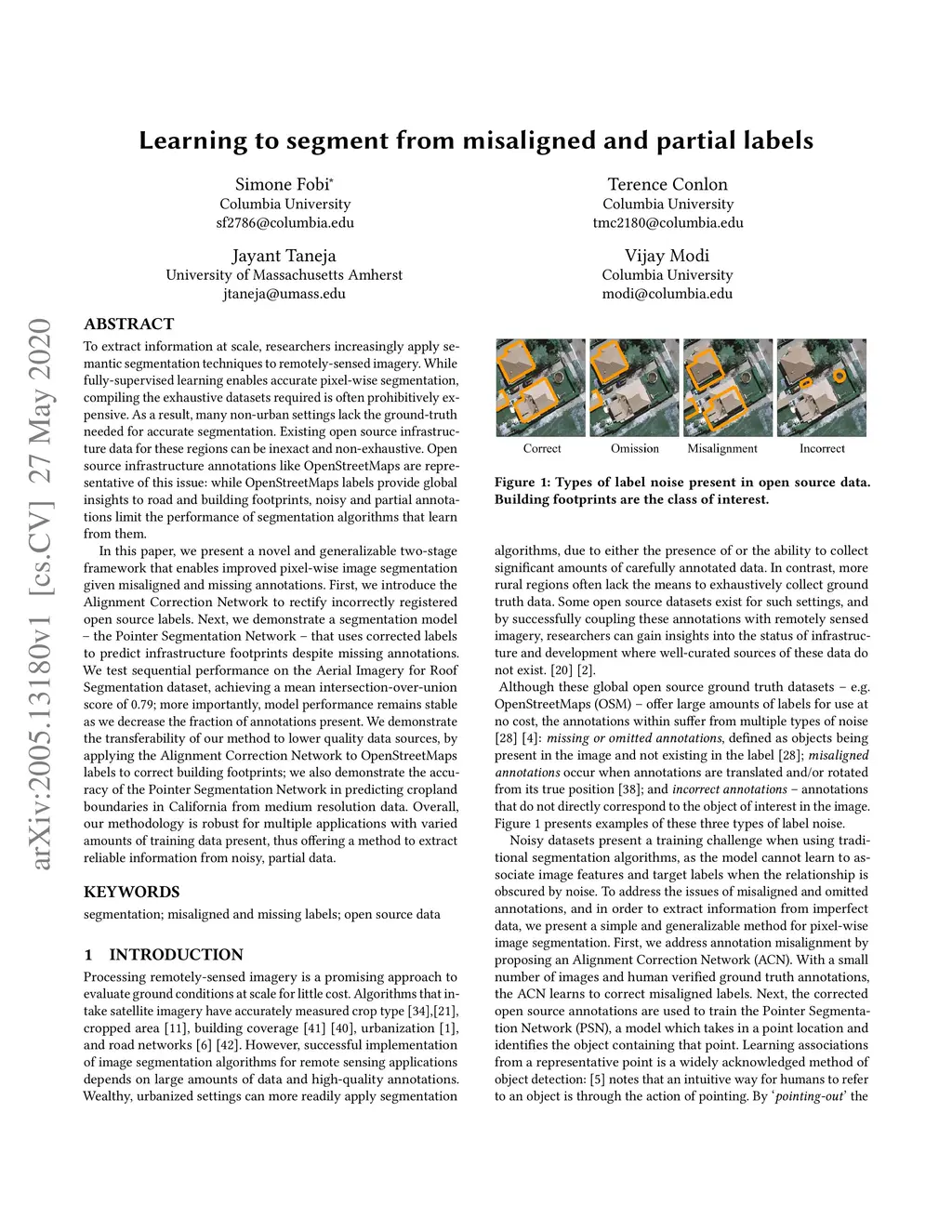 To extract information at scale, researchers increasingly apply semantic segmentation techniques to remotely-sensed imagery. While fully-supervised learning enables accurate pixel-wise segmentation, compiling the exhaustive datasets required is often prohibitively expensive. As a result, many non-urban settings lack the ground-truth needed for accurate segmentation. Existing open source infrastructure data for these regions can be inexact and non-exhaustive. Open source infrastructure annotations like OpenStreetMaps (OSM) are representative of this issue: while OSM labels provide global insights to road and building footprints, noisy and partial annotations limit the performance of segmentation algorithms that learn from them. In this paper, we present a novel and generalizable two-stage framework that enables improved pixel-wise image segmentation given misaligned and missing annotations. First, we introduce the Alignment Correction Network to rectify incorrectly registered open source labels. Next, we demonstrate a segmentation model -- the Pointer Segmentation Network -- that uses corrected labels to predict infrastructure footprints despite missing annotations. We test sequential performance on the AIRS dataset, achieving a mean intersection-over-union score of 0.79; more importantly, model performance remains stable as we decrease the fraction of annotations present. We demonstrate the transferability of our method to lower quality data, by applying the Alignment Correction Network to OSM labels to correct building footprints; we also demonstrate the accuracy of the Pointer Segmentation Network in predicting cropland boundaries in California from medium resolution data. Overall, our methodology is robust for multiple applications with varied amounts of training data present, thus offering a method to extract reliable information from noisy, partial data.
