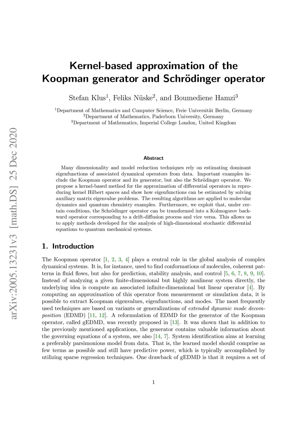 Many dimensionality and model reduction techniques rely on estimating dominant eigenfunctions of associated dynamical operators from data. Important examples include the Koopman operator and its generator, but also the Schr\"odinger operator. We propose a kernel-based method for the approximation of differential operators in reproducing kernel Hilbert spaces and show how eigenfunctions can be estimated by solving auxiliary matrix eigenvalue problems. The resulting algorithms are applied to molecular dynamics and quantum chemistry examples. Furthermore, we exploit that, under certain conditions, the Schr\"odinger operator can be transformed into a Kolmogorov backward operator corresponding to a drift-diffusion process and vice versa. This allows us to apply methods developed for the analysis of high-dimensional stochastic differential equations to quantum mechanical systems.