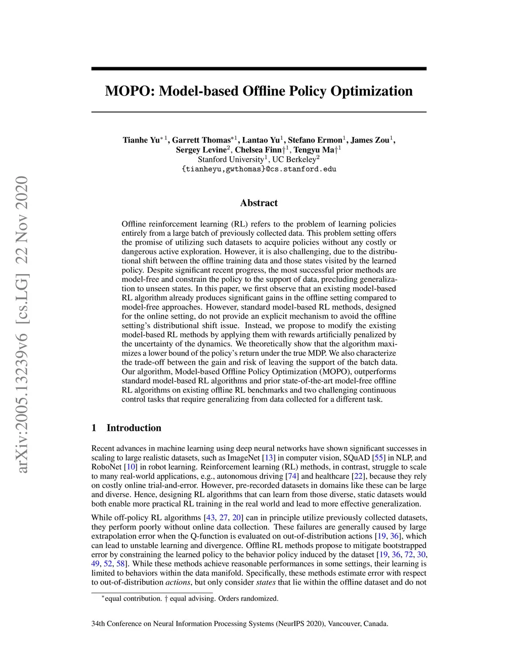 Offline reinforcement learning (RL) refers to the problem of learning policies entirely from a large batch of previously collected data. This problem setting offers the promise of utilizing such datasets to acquire policies without any costly or dangerous active exploration. However, it is also challenging, due to the distributional shift between the offline training data and those states visited by the learned policy. Despite significant recent progress, the most successful prior methods are model-free and constrain the policy to the support of data, precluding generalization to unseen states. In this paper, we first observe that an existing model-based RL algorithm already produces significant gains in the offline setting compared to model-free approaches. However, standard model-based RL methods, designed for the online setting, do not provide an explicit mechanism to avoid the offline setting's distributional shift issue. Instead, we propose to modify the existing model-based RL methods by applying them with rewards artificially penalized by the uncertainty of the dynamics. We theoretically show that the algorithm maximizes a lower bound of the policy's return under the true MDP. We also characterize the trade-off between the gain and risk of leaving the support of the batch data. Our algorithm, Model-based Offline Policy Optimization (MOPO), outperforms standard model-based RL algorithms and prior state-of-the-art model-free offline RL algorithms on existing offline RL benchmarks and two challenging continuous control tasks that require generalizing from data collected for a different task. The code is available at https://github.com/tianheyu927/mopo.