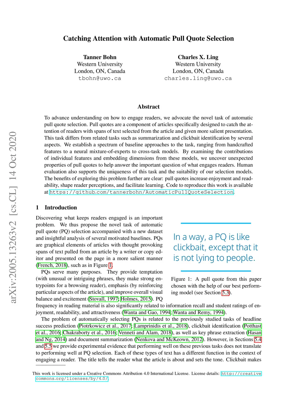 To advance understanding on how to engage readers, we advocate the novel task of automatic pull quote selection. Pull quotes are a component of articles specifically designed to catch the attention of readers with spans of text selected from the article and given more salient presentation. This task differs from related tasks such as summarization and clickbait identification by several aspects. We establish a spectrum of baseline approaches to the task, ranging from handcrafted features to a neural mixture-of-experts to cross-task models. By examining the contributions of individual features and embedding dimensions from these models, we uncover unexpected properties of pull quotes to help answer the important question of what engages readers. Human evaluation also supports the uniqueness of this task and the suitability of our selection models. The benefits of exploring this problem further are clear: pull quotes increase enjoyment and readability, shape reader perceptions, and facilitate learning. Code to reproduce this work is available at https://github.com/tannerbohn/AutomaticPullQuoteSelection.