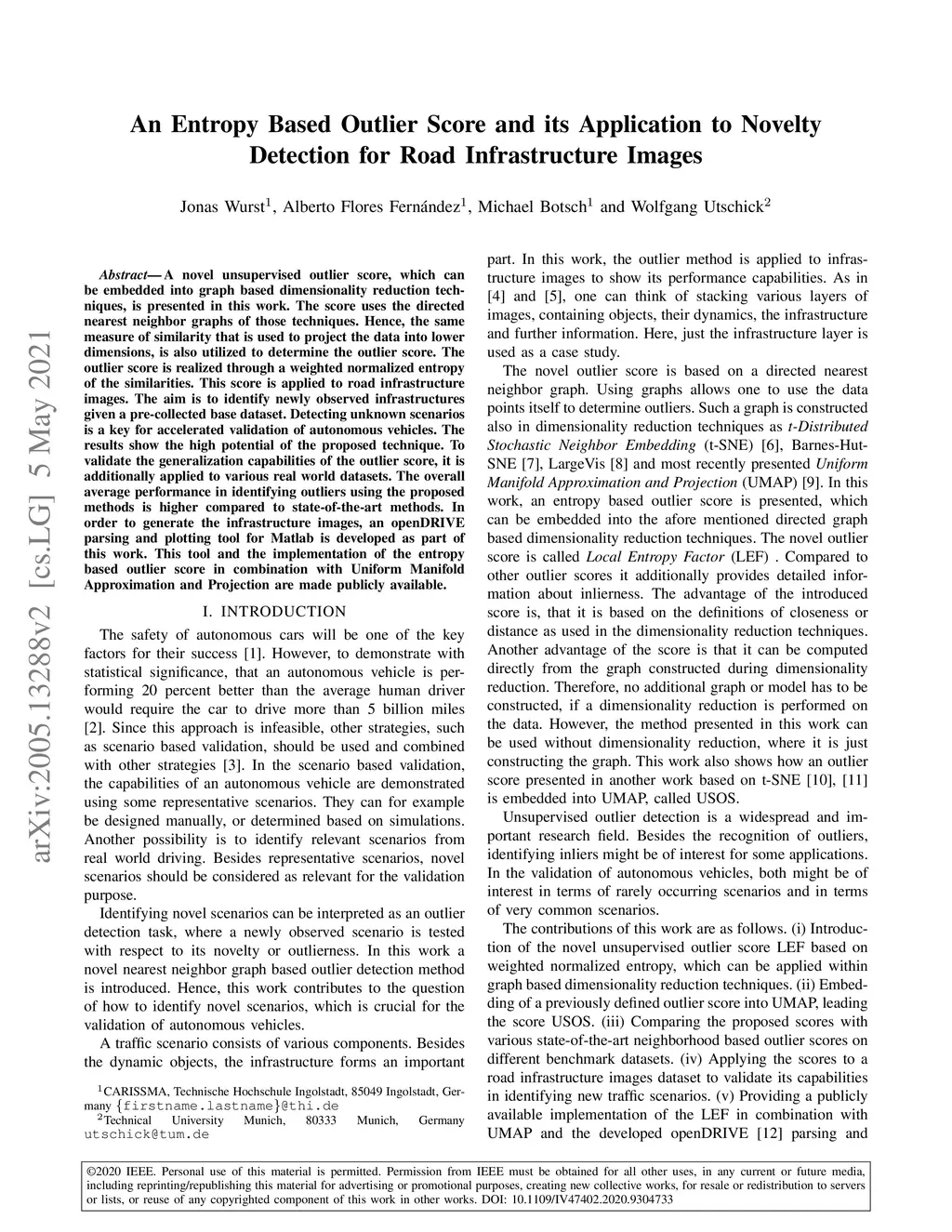 A novel unsupervised outlier score, which can be embedded into graph based dimensionality reduction techniques, is presented in this work. The score uses the directed nearest neighbor graphs of those techniques. Hence, the same measure of similarity that is used to project the data into lower dimensions, is also utilized to determine the outlier score. The outlier score is realized through a weighted normalized entropy of the similarities. This score is applied to road infrastructure images. The aim is to identify newly observed infrastructures given a pre-collected base dataset. Detecting unknown scenarios is a key for accelerated validation of autonomous vehicles. The results show the high potential of the proposed technique. To validate the generalization capabilities of the outlier score, it is additionally applied to various real world datasets. The overall average performance in identifying outliers using the proposed methods is higher compared to state-of-the-art methods. In order to generate the infrastructure images, an openDRIVE parsing and plotting tool for Matlab is developed as part of this work. This tool and the implementation of the entropy based outlier score in combination with Uniform Manifold Approximation and Projection are made publicly available.