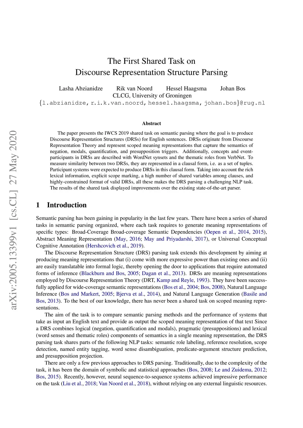 The paper presents the IWCS 2019 shared task on semantic parsing where the goal is to produce Discourse Representation Structures (DRSs) for English sentences. DRSs originate from Discourse Representation Theory and represent scoped meaning representations that capture the semantics of negation, modals, quantification, and presupposition triggers. Additionally, concepts and event-participants in DRSs are described with WordNet synsets and the thematic roles from VerbNet. To measure similarity between two DRSs, they are represented in a clausal form, i.e. as a set of tuples. Participant systems were expected to produce DRSs in this clausal form. Taking into account the rich lexical information, explicit scope marking, a high number of shared variables among clauses, and highly-constrained format of valid DRSs, all these makes the DRS parsing a challenging NLP task. The results of the shared task displayed improvements over the existing state-of-the-art parser.