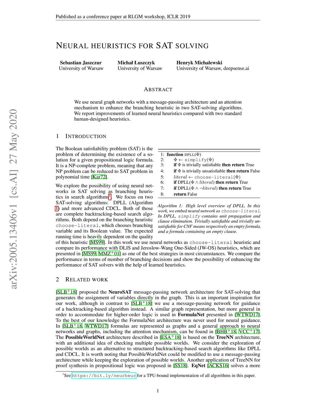 We use neural graph networks with a message-passing architecture and an attention mechanism to enhance the branching heuristic in two SAT-solving algorithms. We report improvements of learned neural heuristics compared with two standard human-designed heuristics.
