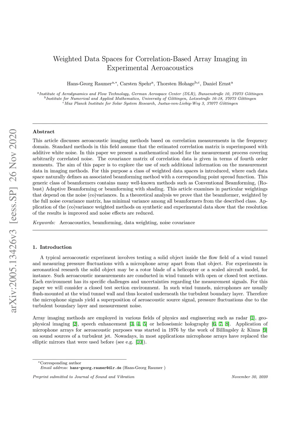 This article discusses aeroacoustic imaging methods based on correlation measurements in the frequency domain. Standard methods in this field assume that the estimated correlation matrix is superimposed with additive white noise. In this paper we present a mathematical model for the measurement process covering arbitrarily correlated noise. The covariance matrix of correlation data is given in terms of fourth order moments. The aim of this paper is to explore the use of such additional information on the measurement data in imaging methods. For this purpose a class of weighted data spaces is introduced, where each data space naturally defines an associated beamforming method with a corresponding point spread function. This generic class of beamformers contains many well-known methods such as Conventional Beamforming, (Robust) Adaptive Beamforming or beamforming with shading. This article examines in particular weightings that depend on the noise (co)variances. In a theoretical analysis we prove that the beamformer, weighted by the full noise covariance matrix, has minimal variance among all beamformers from the described class. Application of the (co)variance weighted methods on synthetic and experimental data show that the resolution of the results is improved and noise effects are reduced.