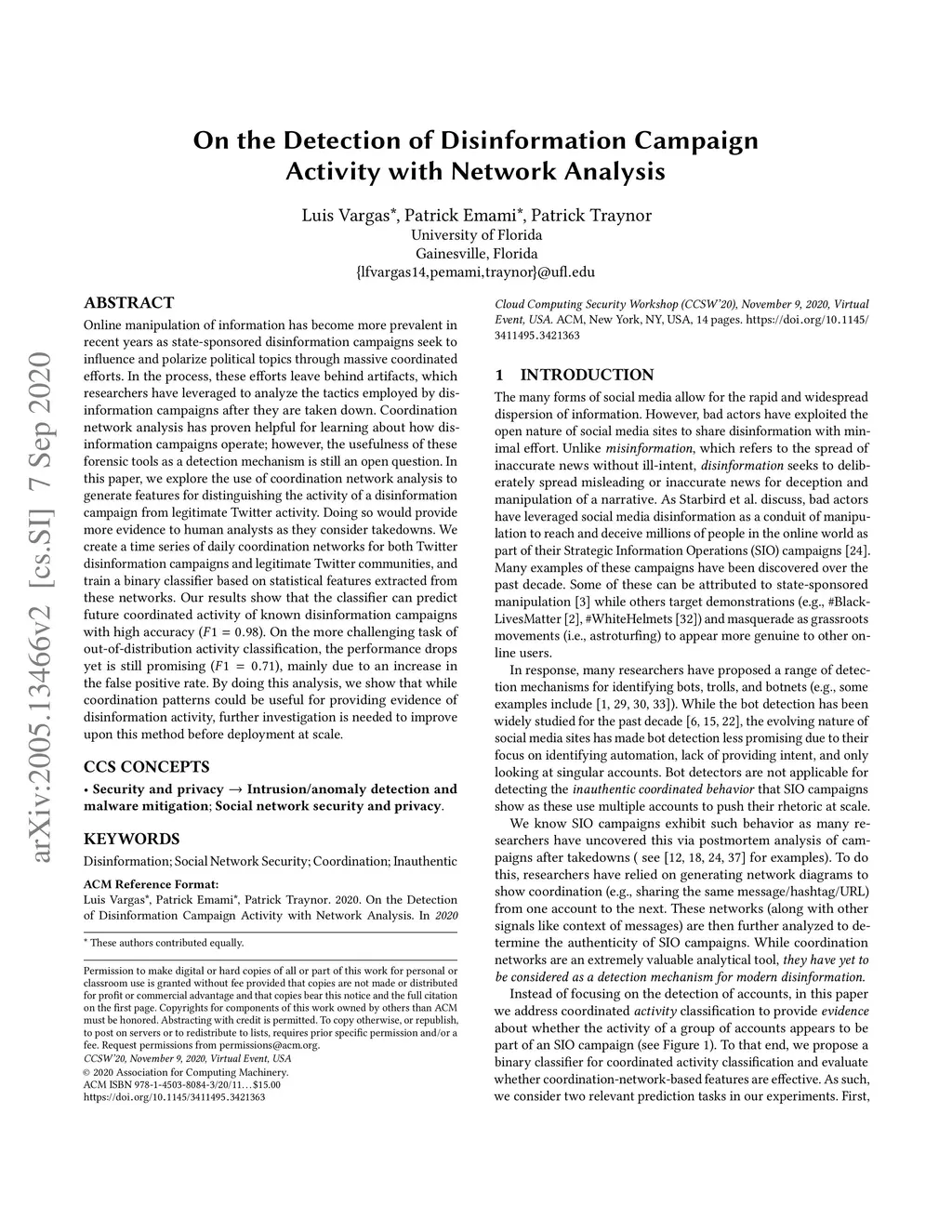 Online manipulation of information has become more prevalent in recent years as state-sponsored disinformation campaigns seek to influence and polarize political topics through massive coordinated efforts. In the process, these efforts leave behind artifacts, which researchers have leveraged to analyze the tactics employed by disinformation campaigns after they are taken down. Coordination network analysis has proven helpful for learning about how disinformation campaigns operate; however, the usefulness of these forensic tools as a detection mechanism is still an open question. In this paper, we explore the use of coordination network analysis to generate features for distinguishing the activity of a disinformation campaign from legitimate Twitter activity. Doing so would provide more evidence to human analysts as they consider takedowns. We create a time series of daily coordination networks for both Twitter disinformation campaigns and legitimate Twitter communities, and train a binary classifier based on statistical features extracted from these networks. Our results show that the classifier can predict future coordinated activity of known disinformation campaigns with high accuracy (F1 = 0.98). On the more challenging task of out-of-distribution activity classification, the performance drops yet is still promising (F1 = 0.71), mainly due to an increase in the false positive rate. By doing this analysis, we show that while coordination patterns could be useful for providing evidence of disinformation activity, further investigation is needed to improve upon this method before deployment at scale.