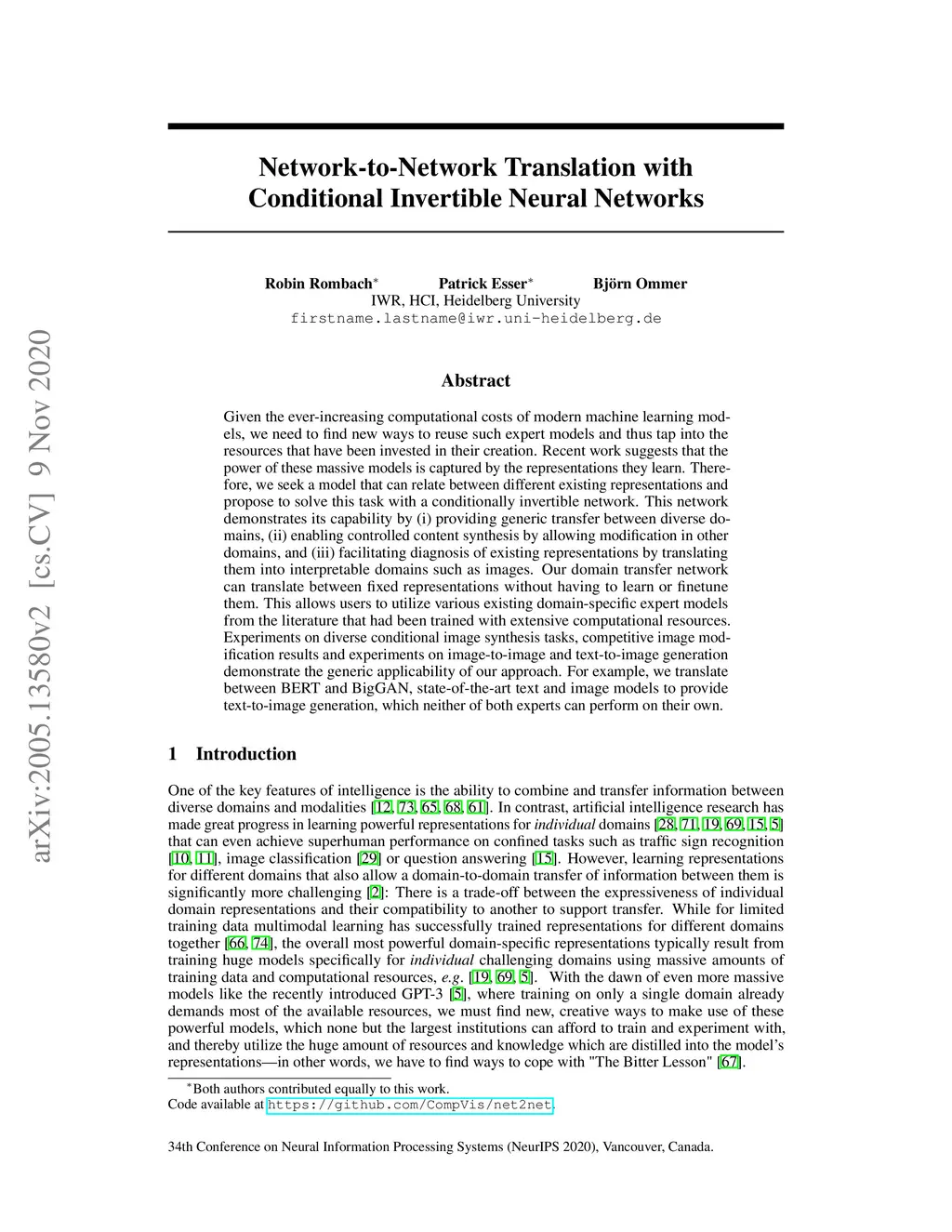 Given the ever-increasing computational costs of modern machine learning models, we need to find new ways to reuse such expert models and thus tap into the resources that have been invested in their creation. Recent work suggests that the power of these massive models is captured by the representations they learn. Therefore, we seek a model that can relate between different existing representations and propose to solve this task with a conditionally invertible network. This network demonstrates its capability by (i) providing generic transfer between diverse domains, (ii) enabling controlled content synthesis by allowing modification in other domains, and (iii) facilitating diagnosis of existing representations by translating them into interpretable domains such as images. Our domain transfer network can translate between fixed representations without having to learn or finetune them. This allows users to utilize various existing domain-specific expert models from the literature that had been trained with extensive computational resources. Experiments on diverse conditional image synthesis tasks, competitive image modification results and experiments on image-to-image and text-to-image generation demonstrate the generic applicability of our approach. For example, we translate between BERT and BigGAN, state-of-the-art text and image models to provide text-to-image generation, which neither of both experts can perform on their own.