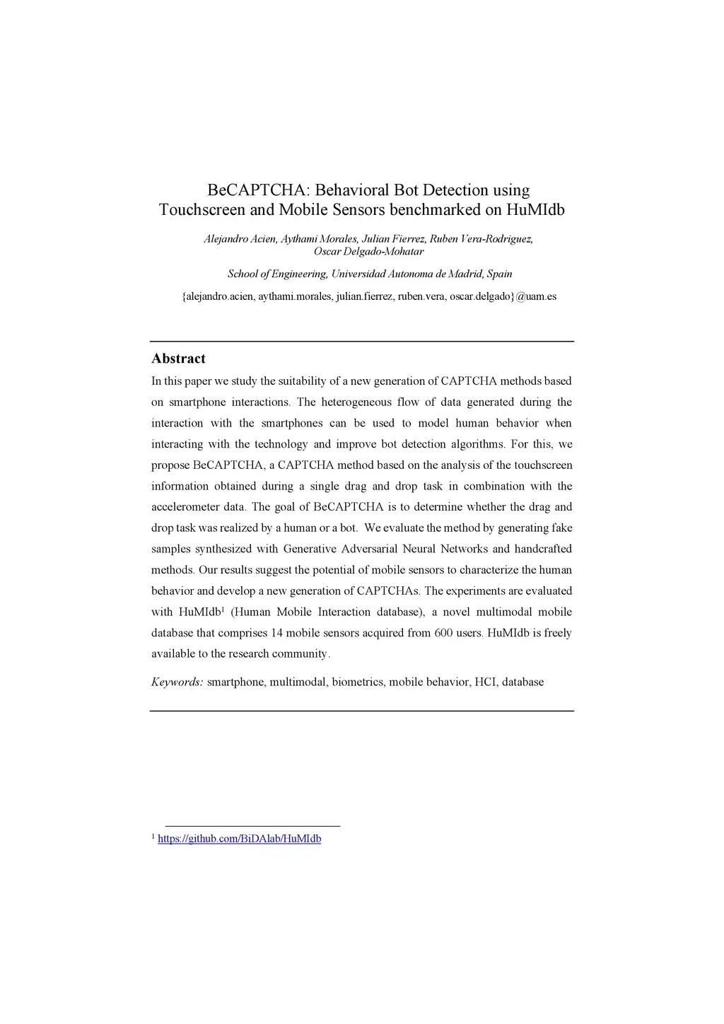 In this paper we study the suitability of a new generation of CAPTCHA methods based on smartphone interactions. The heterogeneous flow of data generated during the interaction with the smartphones can be used to model human behavior when interacting with the technology and improve bot detection algorithms. For this, we propose BeCAPTCHA, a CAPTCHA method based on the analysis of the touchscreen information obtained during a single drag and drop task in combination with the accelerometer data. The goal of BeCAPTCHA is to determine whether the drag and drop task was realized by a human or a bot. We evaluate the method by generating fake samples synthesized with Generative Adversarial Neural Networks and handcrafted methods. Our results suggest the potential of mobile sensors to characterize the human behavior and develop a new generation of CAPTCHAs. The experiments are evaluated with HuMIdb (Human Mobile Interaction database), a novel multimodal mobile database that comprises 14 mobile sensors acquired from 600 users. HuMIdb is freely available to the research community.
