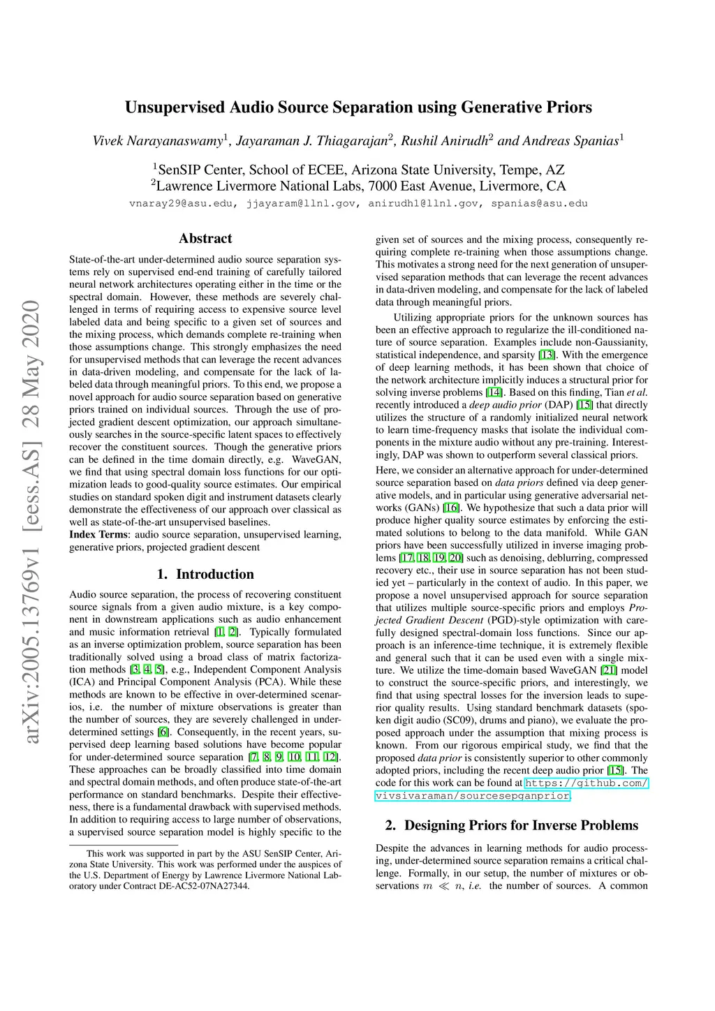 State-of-the-art under-determined audio source separation systems rely on supervised end-end training of carefully tailored neural network architectures operating either in the time or the spectral domain. However, these methods are severely challenged in terms of requiring access to expensive source level labeled data and being specific to a given set of sources and the mixing process, which demands complete re-training when those assumptions change. This strongly emphasizes the need for unsupervised methods that can leverage the recent advances in data-driven modeling, and compensate for the lack of labeled data through meaningful priors. To this end, we propose a novel approach for audio source separation based on generative priors trained on individual sources. Through the use of projected gradient descent optimization, our approach simultaneously searches in the source-specific latent spaces to effectively recover the constituent sources. Though the generative priors can be defined in the time domain directly, e.g. WaveGAN, we find that using spectral domain loss functions for our optimization leads to good-quality source estimates. Our empirical studies on standard spoken digit and instrument datasets clearly demonstrate the effectiveness of our approach over classical as well as state-of-the-art unsupervised baselines.