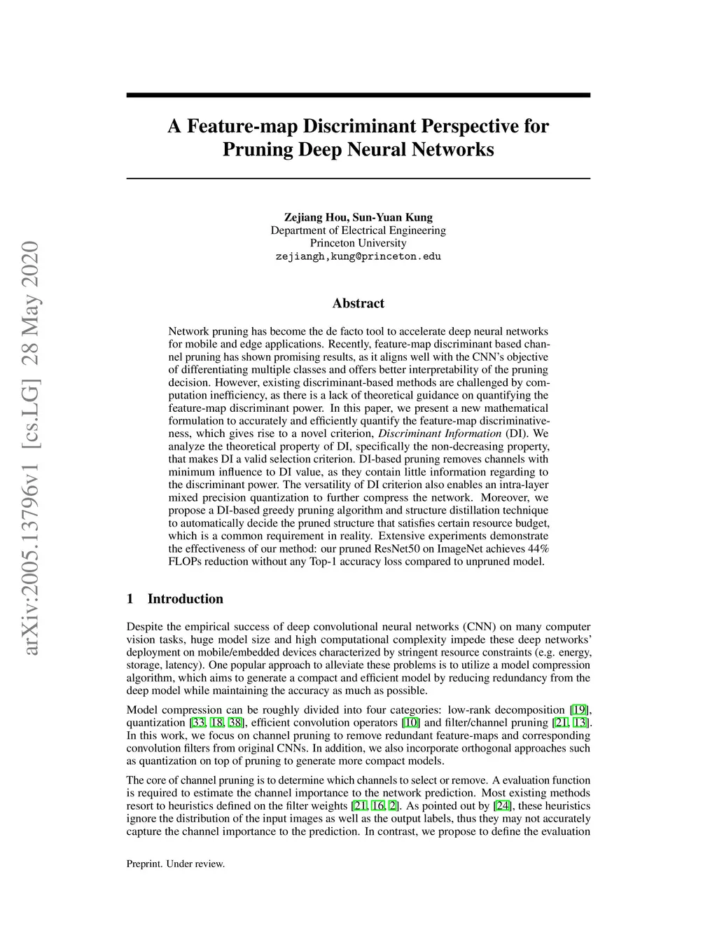 Network pruning has become the de facto tool to accelerate deep neural networks for mobile and edge applications. Recently, feature-map discriminant based channel pruning has shown promising results, as it aligns well with the CNN objective of differentiating multiple classes and offers better interpretability of the pruning decision. However, existing discriminant-based methods are challenged by computation inefficiency, as there is a lack of theoretical guidance on quantifying the feature-map discriminant power. In this paper, we present a new mathematical formulation to accurately and efficiently quantify the feature-map discriminativeness, which gives rise to a novel criterion,Discriminant Information(DI). We analyze the theoretical property of DI, specifically the non-decreasing property, that makes DI a valid selection criterion. DI-based pruning removes channels with minimum influence to DI value, as they contain little information regarding to the discriminant power. The versatility of DI criterion also enables an intra-layer mixed precision quantization to further compress the network. Moreover, we propose a DI-based greedy pruning algorithm and structure distillation technique to automatically decide the pruned structure that satisfies certain resource budget, which is a common requirement in reality. Extensive experiments demonstratethe effectiveness of our method: our pruned ResNet50 on ImageNet achieves 44% FLOPs reduction without any Top-1 accuracy loss compared to unpruned model