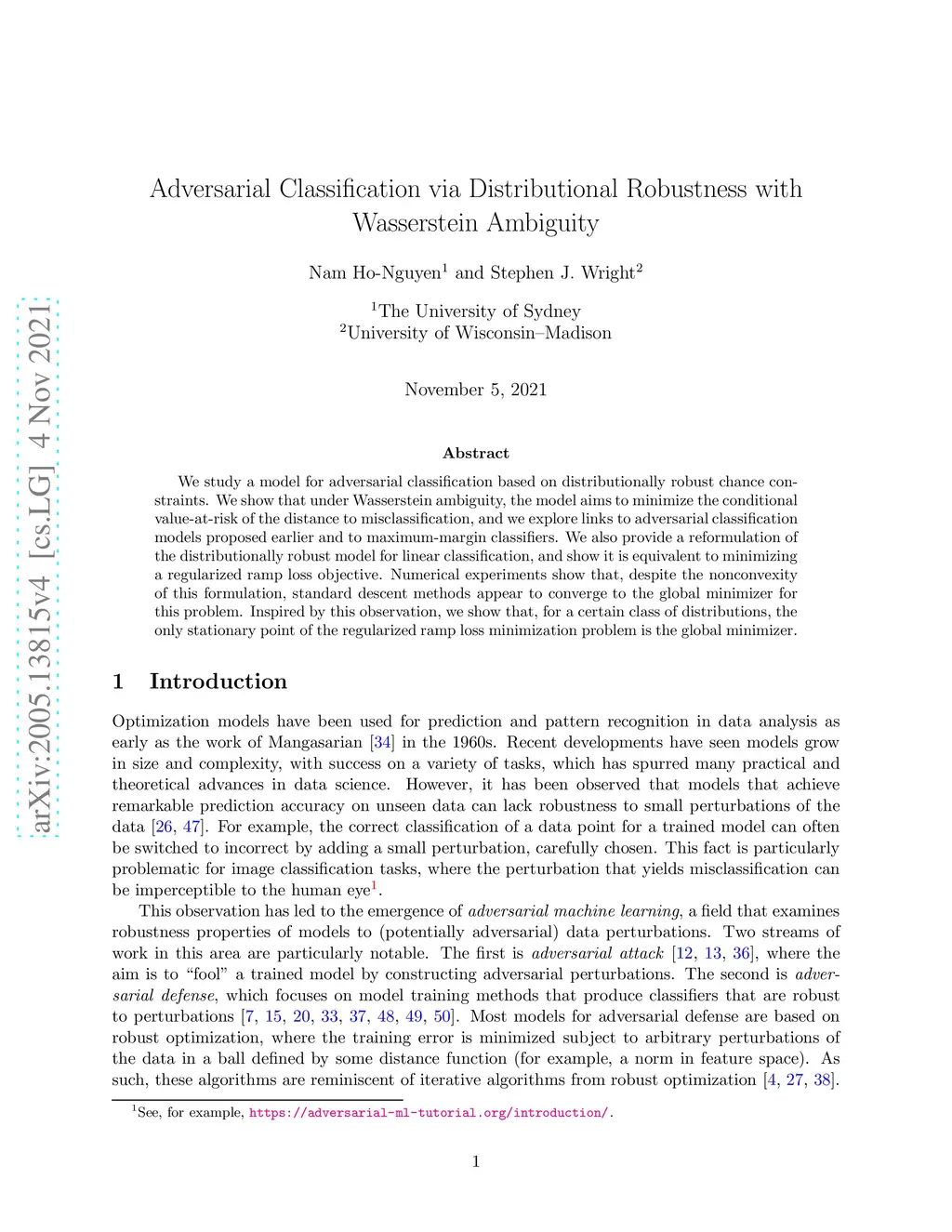 We study a model for adversarial classification based on distributionally robust chance constraints. We show that under Wasserstein ambiguity, the model aims to minimize the conditional value-at-risk of the distance to misclassification, and we explore links to adversarial classification models proposed earlier and to maximum-margin classifiers. We also provide a reformulation of the distributionally robust model for linear classification, and show it is equivalent to minimizing a regularized ramp loss objective. Numerical experiments show that, despite the nonconvexity of this formulation, standard descent methods appear to converge to the global minimizer for this problem. Inspired by this observation, we show that, for a certain class of distributions, the only stationary point of the regularized ramp loss minimization problem is the global minimizer.