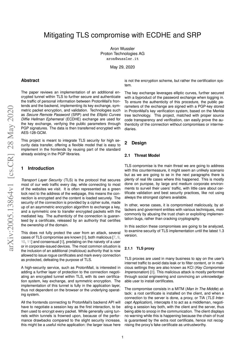 The paper reviews an implementation of an additional encrypted tunnel within TLS to further secure and authenticate the traffic of personal information between ProtonMail's frontends and the backend, implementing its key exchange, symmetric packet encryption, and validation. Technologies such as Secure Remote Password (SRP) and the Elliptic Curves Diffie Hellman Ephemeral (ECDHE) exchange are used for the key exchange, verifying the public parameters through PGP signatures. The data is then transferred encrypted with AES-128-GCM. This project is meant to integrate TLS security for high security data transfer, offering a flexible model that is easy to implement in the frontends by reusing part of the standard already existing in the PGP libraries.