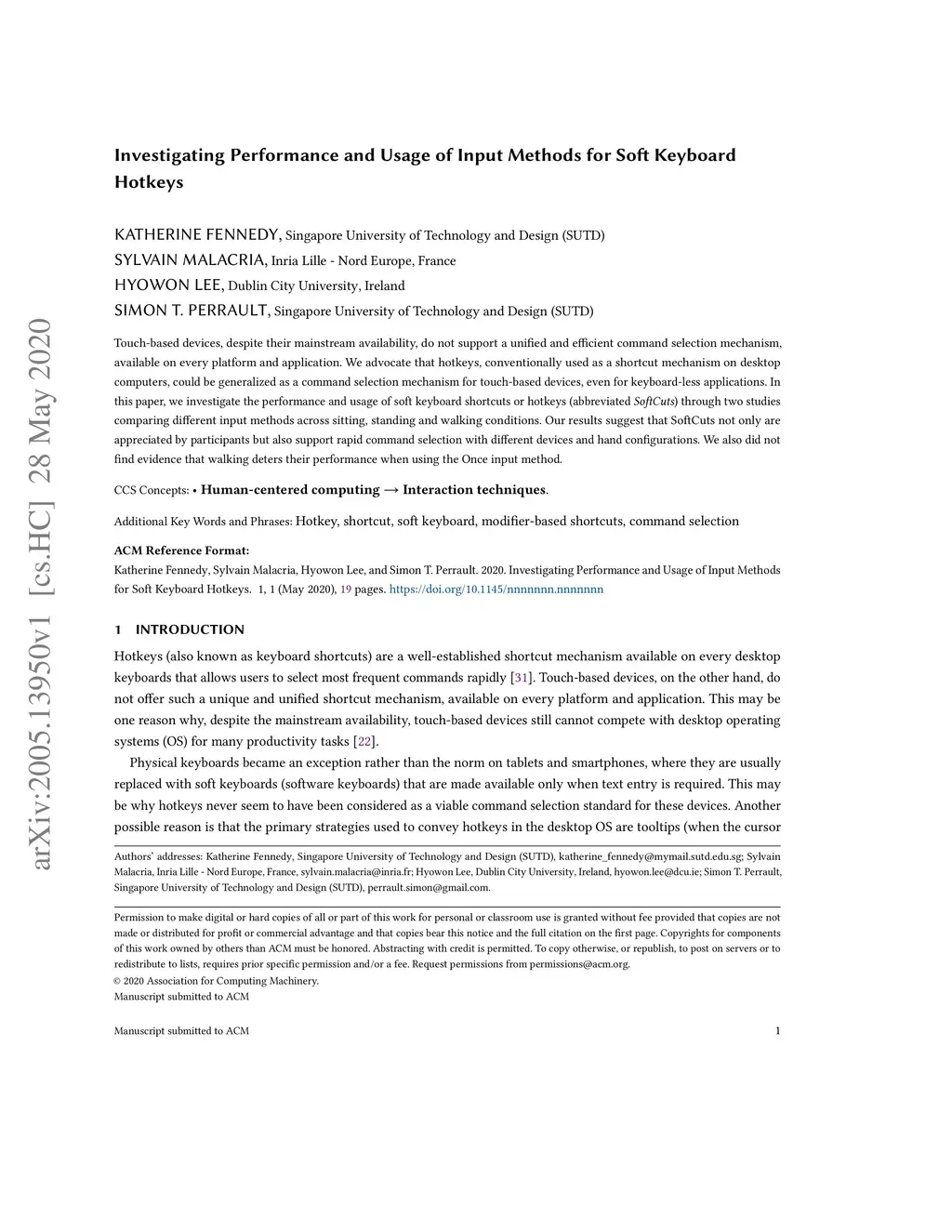 Touch-based devices, despite their mainstream availability, do not support a unified and efficient command selection mechanism, available on every platform and application. We advocate that hotkeys, conventionally used as a shortcut mechanism on desktop computers, could be generalized as a command selection mechanism for touch-based devices, even for keyboard-less applications. In this paper, we investigate the performance and usage of soft keyboard shortcuts or hotkeys (abbreviated SoftCuts) through two studies comparing different input methods across sitting, standing and walking conditions. Our results suggest that SoftCuts not only are appreciated by participants but also support rapid command selection with different devices and hand configurations. We also did not find evidence that walking deters their performance when using the Once input method.