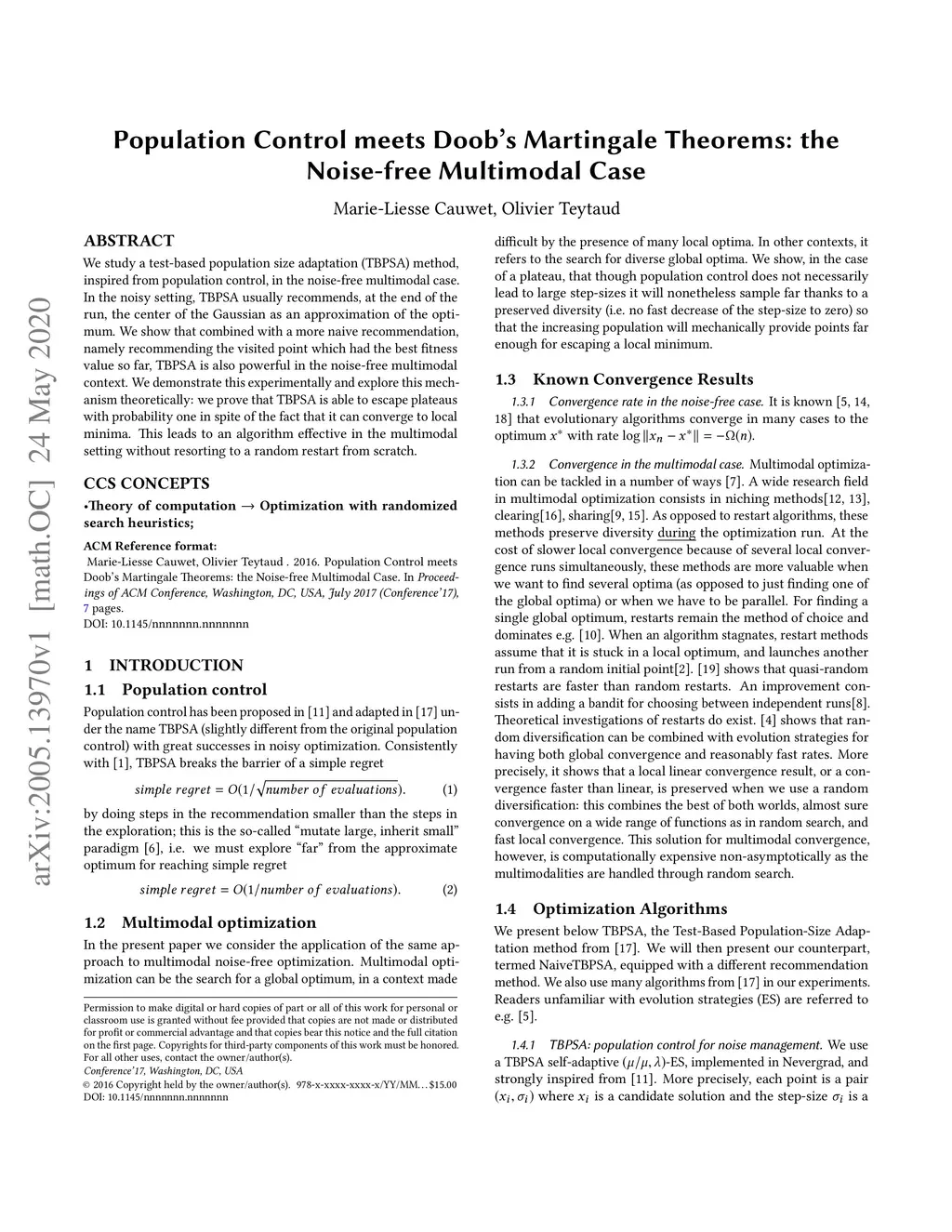 We study a test-based population size adaptation (TBPSA) method, inspired from population control, in the noise-free multimodal case. In the noisy setting, TBPSA usually recommends, at the end of the run, the center of the Gaussian as an approximation of the optimum. We show that combined with a more naive recommendation, namely recommending the visited point which had the best fitness value so far, TBPSA is also powerful in the noise-free multimodal context. We demonstrate this experimentally and explore this mechanism theoretically: we prove that TBPSA is able to escape plateaus with probability one in spite of the fact that it can converge to local minima. This leads to an algorithm effective in the multimodal setting without resorting to a random restart from scratch.