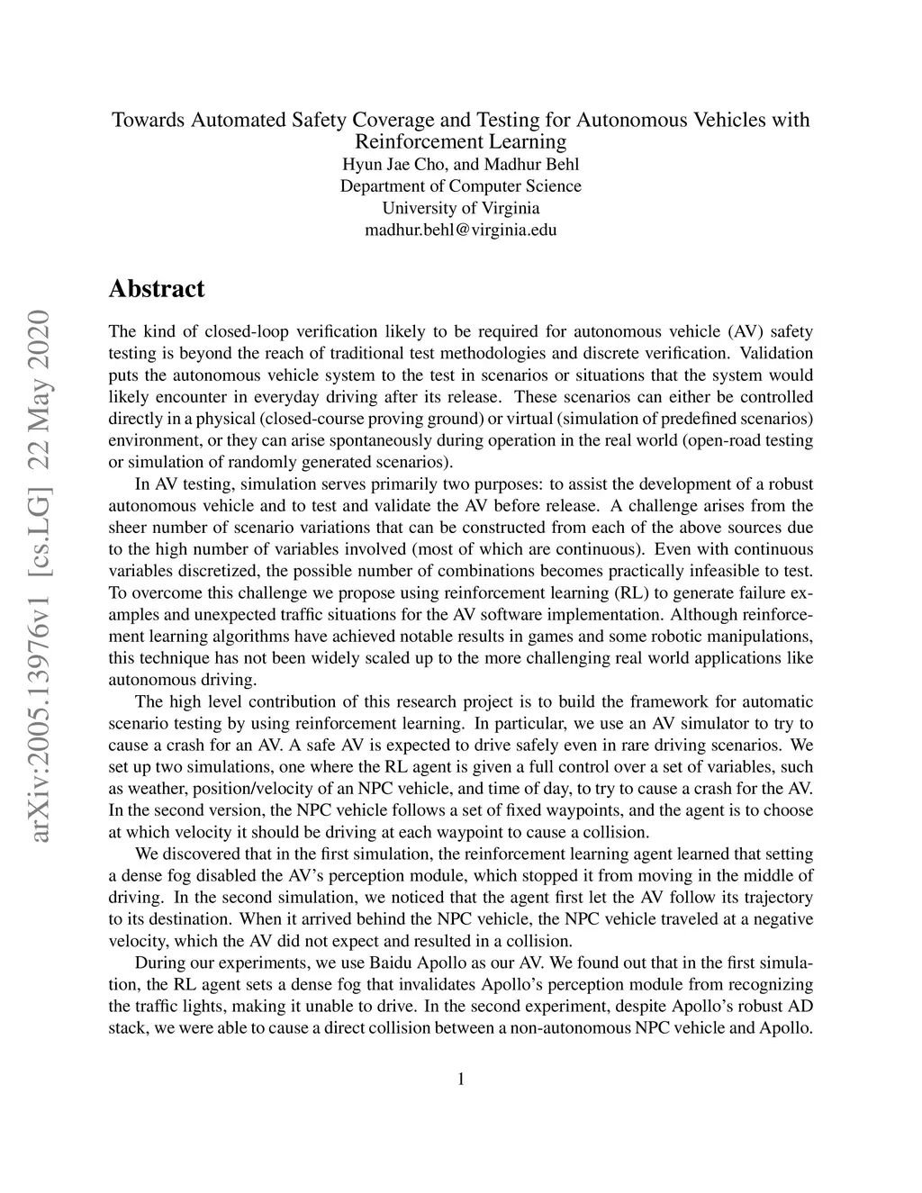 The kind of closed-loop verification likely to be required for autonomous vehicle (AV) safety testing is beyond the reach of traditional test methodologies and discrete verification. Validation puts the autonomous vehicle system to the test in scenarios or situations that the system would likely encounter in everyday driving after its release. These scenarios can either be controlled directly in a physical (closed-course proving ground) or virtual (simulation of predefined scenarios) environment, or they can arise spontaneously during operation in the real world (open-road testing or simulation of randomly generated scenarios). In AV testing, simulation serves primarily two purposes: to assist the development of a robust autonomous vehicle and to test and validate the AV before release. A challenge arises from the sheer number of scenario variations that can be constructed from each of the above sources due to the high number of variables involved (most of which are continuous). Even with continuous variables discretized, the possible number of combinations becomes practically infeasible to test. To overcome this challenge we propose using reinforcement learning (RL) to generate failure examples and unexpected traffic situations for the AV software implementation. Although reinforcement learning algorithms have achieved notable results in games and some robotic manipulations, this technique has not been widely scaled up to the more challenging real world applications like autonomous driving.