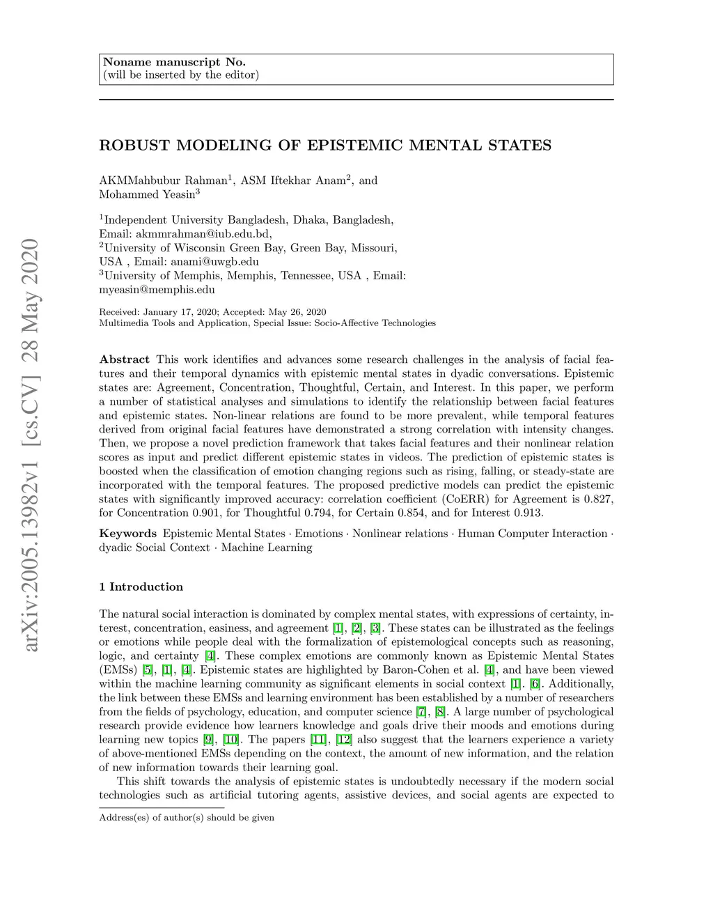 This work identifies and advances some research challenges in the analysis of facial features and their temporal dynamics with epistemic mental states in dyadic conversations. Epistemic states are: Agreement, Concentration, Thoughtful, Certain, and Interest. In this paper, we perform a number of statistical analyses and simulations to identify the relationship between facial features and epistemic states. Non-linear relations are found to be more prevalent, while temporal features derived from original facial features have demonstrated a strong correlation with intensity changes. Then, we propose a novel prediction framework that takes facial features and their nonlinear relation scores as input and predict different epistemic states in videos. The prediction of epistemic states is boosted when the classification of emotion changing regions such as rising, falling, or steady-state are incorporated with the temporal features. The proposed predictive models can predict the epistemic states with significantly improved accuracy: correlation coefficient (CoERR) for Agreement is 0.827, for Concentration 0.901, for Thoughtful 0.794, for Certain 0.854, and for Interest 0.913.