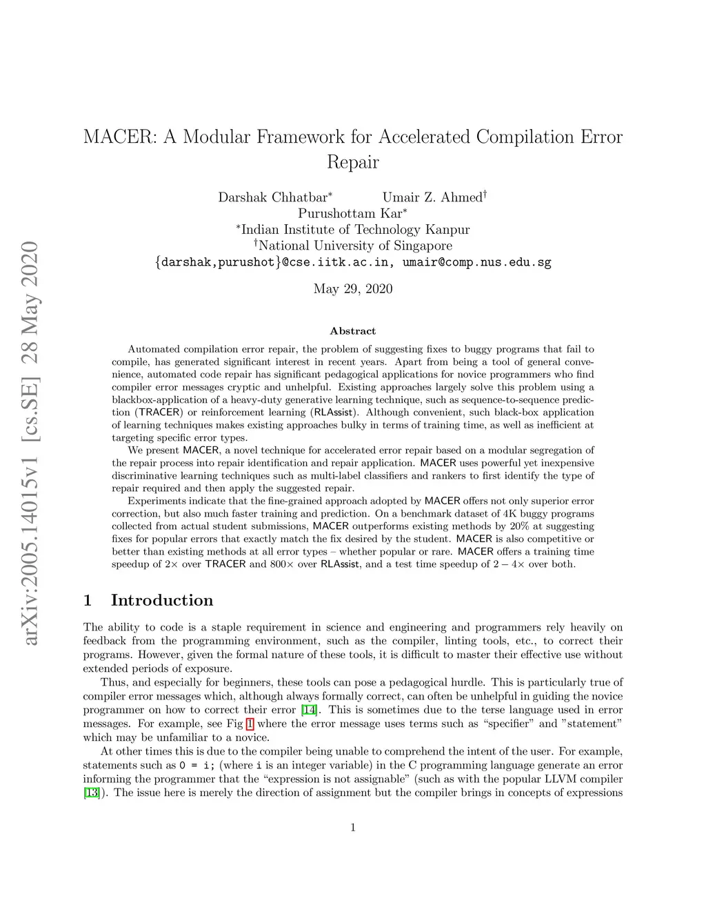 Automated compilation error repair, the problem of suggesting fixes to buggy programs that fail to compile, has generated significant interest in recent years. Apart from being a tool of general convenience, automated code repair has significant pedagogical applications for novice programmers who find compiler error messages cryptic and unhelpful. Existing approaches largely solve this problem using a blackbox-application of a heavy-duty generative learning technique, such as sequence-to-sequence prediction (TRACER) or reinforcement learning (RLAssist). Although convenient, such black-box application of learning techniques makes existing approaches bulky in terms of training time, as well as inefficient at targeting specific error types. We present MACER, a novel technique for accelerated error repair based on a modular segregation of the repair process into repair identification and repair application. MACER uses powerful yet inexpensive discriminative learning techniques such as multi-label classifiers and rankers to first identify the type of repair required and then apply the suggested repair. Experiments indicate that the fine-grained approach adopted by MACER offers not only superior error correction, but also much faster training and prediction. On a benchmark dataset of 4K buggy programs collected from actual student submissions, MACER outperforms existing methods by 20% at suggesting fixes for popular errors that exactly match the fix desired by the student. MACER is also competitive or better than existing methods at all error types -- whether popular or rare. MACER offers a training time speedup of 2x over TRACER and 800x over RLAssist, and a test time speedup of 2-4x over both.
