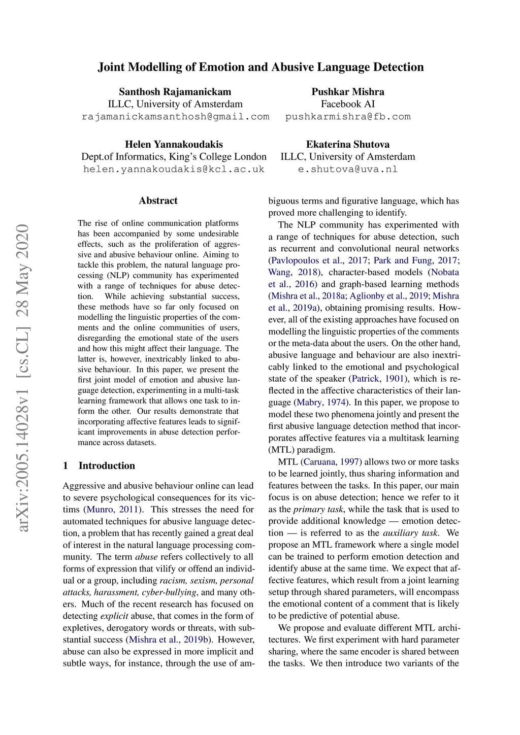 Joint Modelling of Emotion and Abusive Language Detection