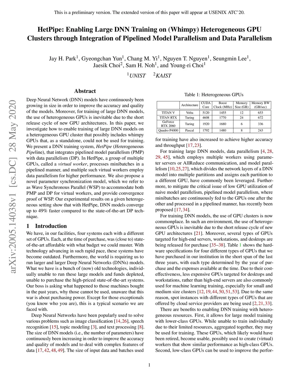 HetPipe: Enabling Large DNN Training on (Whimpy) Heterogeneous GPU