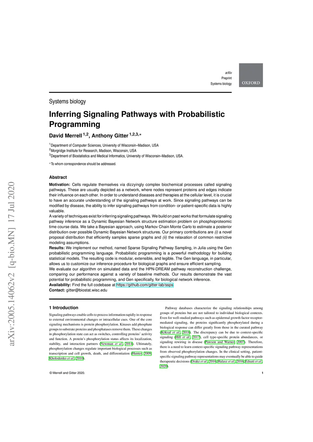Cells regulate themselves via dizzyingly complex biochemical processes called signaling pathways. These are usually depicted as a network, where nodes represent proteins and edges indicate their influence on each other. In order to understand diseases and therapies at the cellular level, it is crucial to have an accurate understanding of the signaling pathways at work. Since signaling pathways can be modified by disease, the ability to infer signaling pathways from condition- or patient-specific data is highly valuable. A variety of techniques exist for inferring signaling pathways. We build on past works that formulate signaling pathway inference as a Dynamic Bayesian Network structure estimation problem on phosphoproteomic time course data. We take a Bayesian approach, using Markov Chain Monte Carlo to estimate a posterior distribution over possible Dynamic Bayesian Network structures. Our primary contributions are (i) a novel proposal distribution that efficiently samples sparse graphs and (ii) the relaxation of common restrictive modeling assumptions. We implement our method, named Sparse Signaling Pathway Sampling, in Julia using the Gen probabilistic programming language. Probabilistic programming is a powerful methodology for building statistical models. The resulting code is modular, extensible, and legible. The Gen language, in particular, allows us to customize our inference procedure for biological graphs and ensure efficient sampling. We evaluate our algorithm on simulated data and the HPN-DREAM pathway reconstruction challenge, comparing our performance against a variety of baseline methods. Our results demonstrate the vast potential for probabilistic programming, and Gen specifically, for biological network inference. Find the full codebase at https://github.com/gitter-lab/ssps