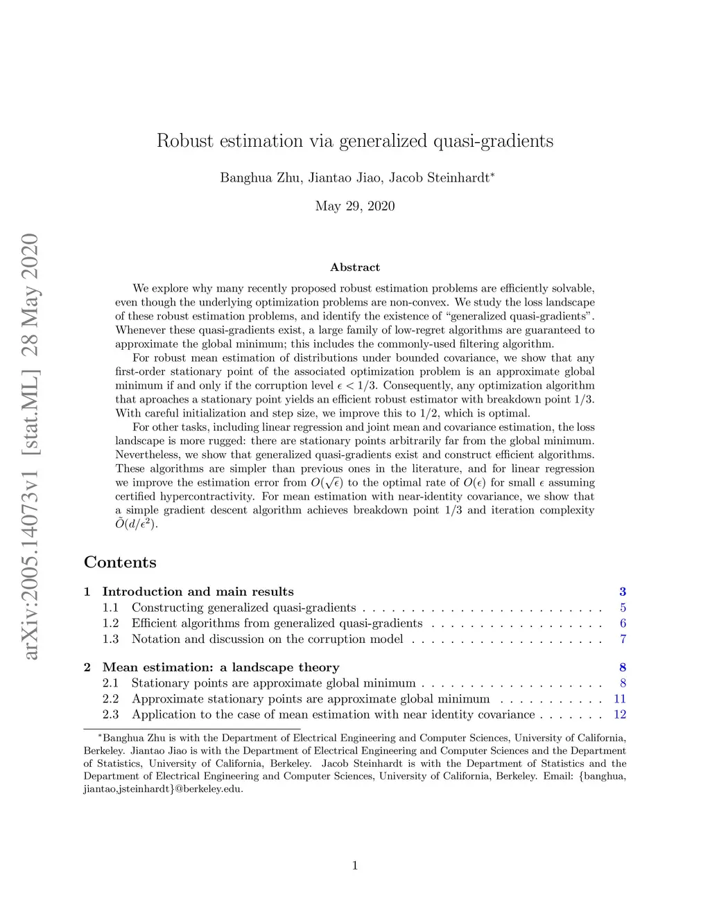 We explore why many recently proposed robust estimation problems are efficiently solvable, even though the underlying optimization problems are non-convex. We study the loss landscape of these robust estimation problems, and identify the existence of "generalized quasi-gradients". Whenever these quasi-gradients exist, a large family of low-regret algorithms are guaranteed to approximate the global minimum; this includes the commonly-used filtering algorithm. For robust mean estimation of distributions under bounded covariance, we show that any first-order stationary point of the associated optimization problem is an {approximate global minimum} if and only if the corruption level . Consequently, any optimization algorithm that aproaches a stationary point yields an efficient robust estimator with breakdown point . With careful initialization and step size, we improve this to , which is optimal. For other tasks, including linear regression and joint mean and covariance estimation, the loss landscape is more rugged: there are stationary points arbitrarily far from the global minimum. Nevertheless, we show that generalized quasi-gradients exist and construct efficient algorithms. These algorithms are simpler than previous ones in the literature, and for linear regression we improve the estimation error from to the optimal rate of for small assuming certified hypercontractivity. For mean estimation with near-identity covariance, we show that a simple gradient descent algorithm achieves breakdown point and iteration complexity .