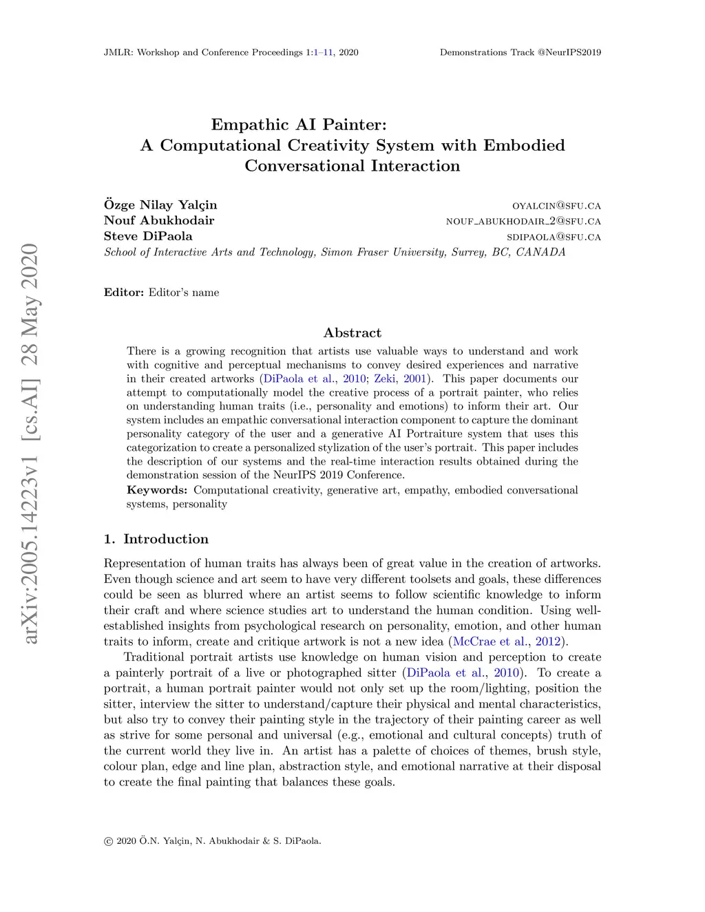 There is a growing recognition that artists use valuable ways to understand and work with cognitive and perceptual mechanisms to convey desired experiences and narrative in their created artworks (DiPaola et al., 2010; Zeki, 2001). This paper documents our attempt to computationally model the creative process of a portrait painter, who relies on understanding human traits (i.e., personality and emotions) to inform their art. Our system includes an empathic conversational interaction component to capture the dominant personality category of the user and a generative AI Portraiture system that uses this categorization to create a personalized stylization of the user's portrait. This paper includes the description of our systems and the real-time interaction results obtained during the demonstration session of the NeurIPS 2019 Conference.