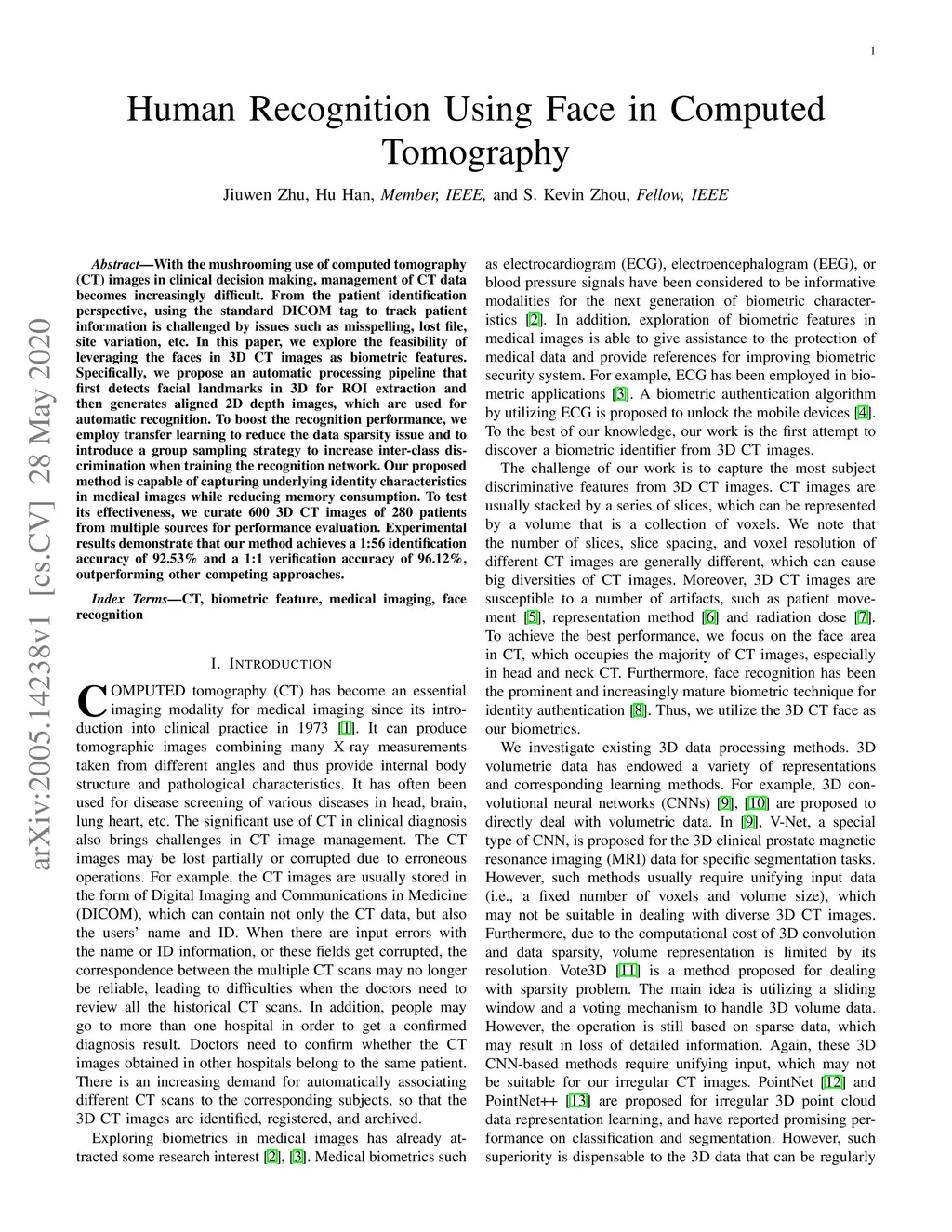 With the mushrooming use of computed tomography (CT) images in clinical decision making, management of CT data becomes increasingly difficult. From the patient identification perspective, using the standard DICOM tag to track patient information is challenged by issues such as misspelling, lost file, site variation, etc. In this paper, we explore the feasibility of leveraging the faces in 3D CT images as biometric features. Specifically, we propose an automatic processing pipeline that first detects facial landmarks in 3D for ROI extraction and then generates aligned 2D depth images, which are used for automatic recognition. To boost the recognition performance, we employ transfer learning to reduce the data sparsity issue and to introduce a group sampling strategy to increase inter-class discrimination when training the recognition network. Our proposed method is capable of capturing underlying identity characteristics in medical images while reducing memory consumption. To test its effectiveness, we curate 600 3D CT images of 280 patients from multiple sources for performance evaluation. Experimental results demonstrate that our method achieves a 1:56 identification accuracy of 92.53% and a 1:1 verification accuracy of 96.12%, outperforming other competing approaches.