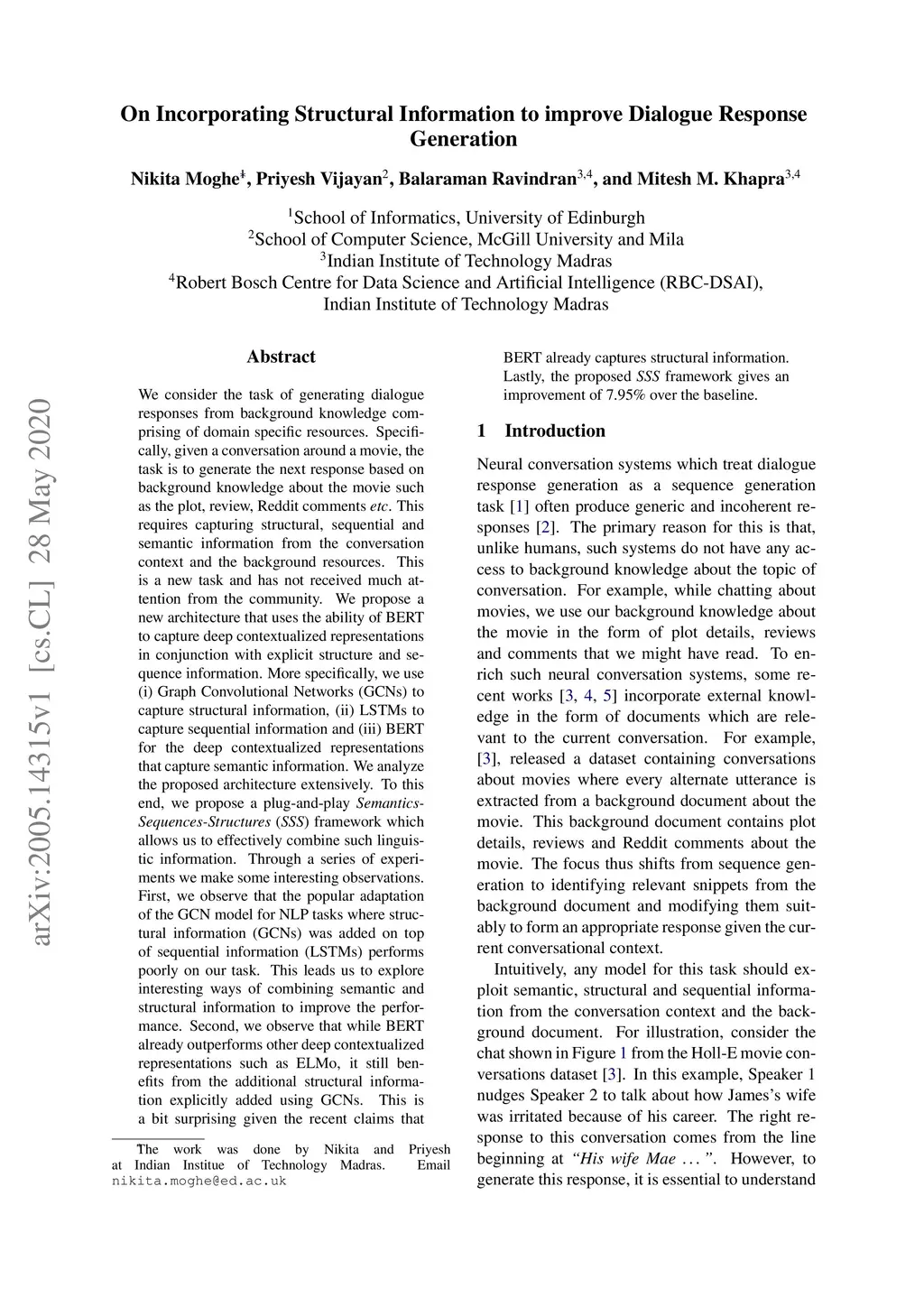 On Incorporating Structural Information to improve Dialogue Response