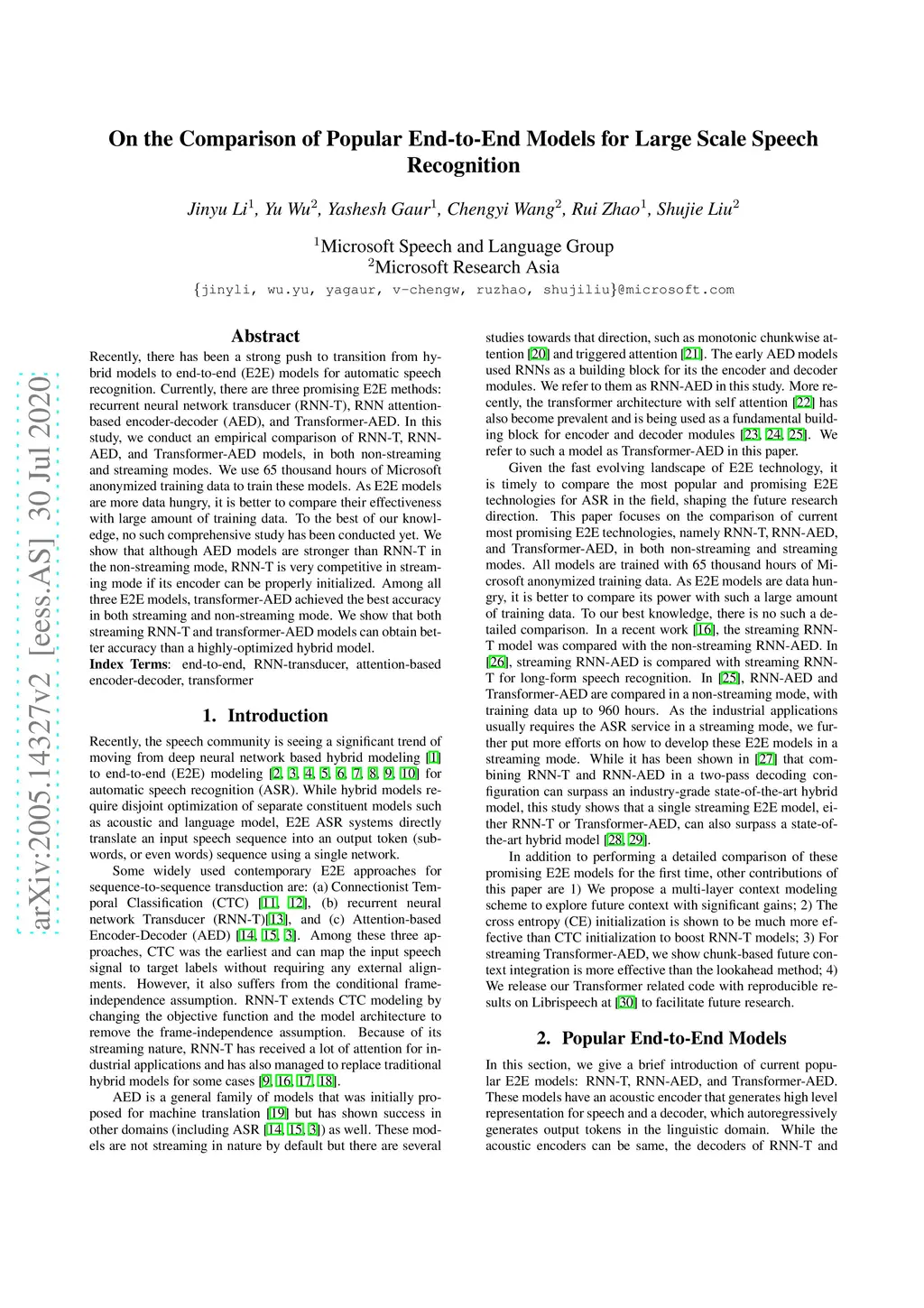 Recently, there has been a strong push to transition from hybrid models to end-to-end (E2E) models for automatic speech recognition. Currently, there are three promising E2E methods: recurrent neural network transducer (RNN-T), RNN attention-based encoder-decoder (AED), and Transformer-AED. In this study, we conduct an empirical comparison of RNN-T, RNN-AED, and Transformer-AED models, in both non-streaming and streaming modes. We use 65 thousand hours of Microsoft anonymized training data to train these models. As E2E models are more data hungry, it is better to compare their effectiveness with large amount of training data. To the best of our knowledge, no such comprehensive study has been conducted yet. We show that although AED models are stronger than RNN-T in the non-streaming mode, RNN-T is very competitive in streaming mode if its encoder can be properly initialized. Among all three E2E models, transformer-AED achieved the best accuracy in both streaming and non-streaming mode. We show that both streaming RNN-T and transformer-AED models can obtain better accuracy than a highly-optimized hybrid model.